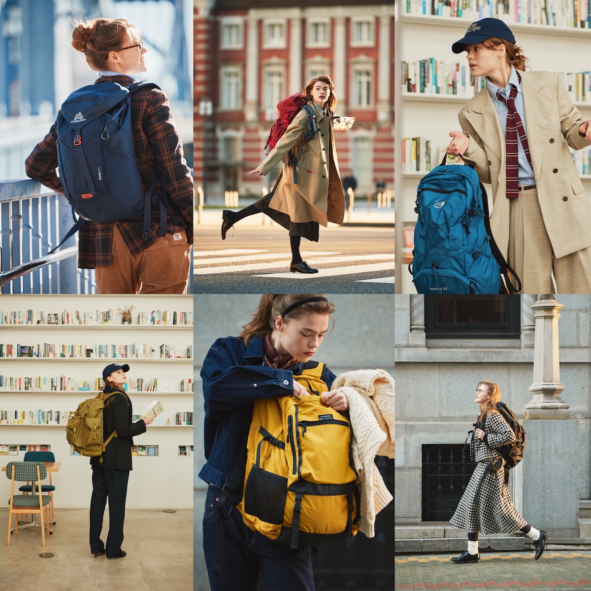 チェックジャケットにブラウンのパンツ。どこか英国ムード漂うトラッドスタイルに合わせたのは、《GREGORY(グレゴリー)》のネイビーバックパック。