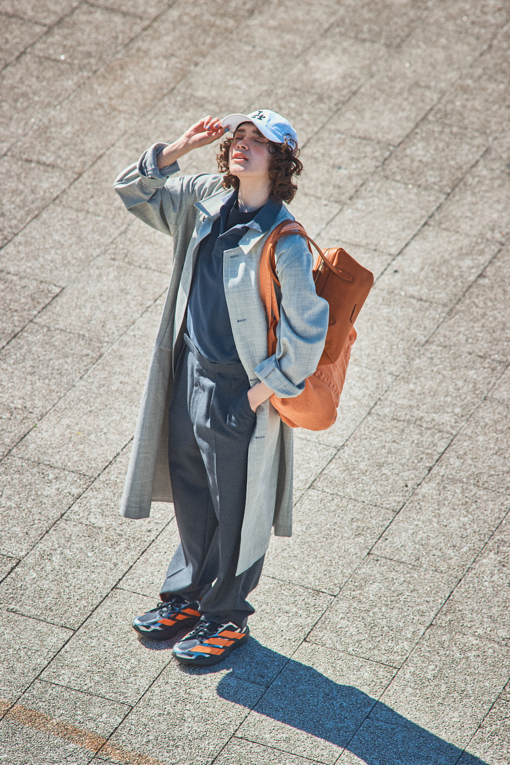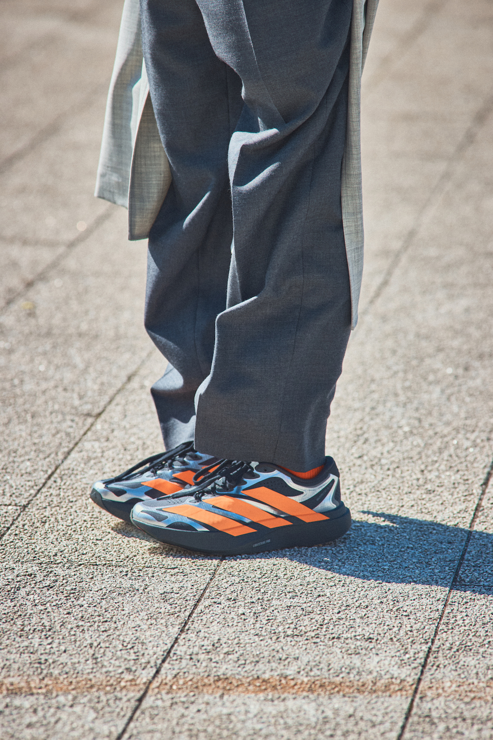 ひと際目を引くオレンジとシルバーが効いたランニングシューズは、《アディダス》の「アディゼロ エヴォ エスエル エクソ」。一見難易度が高そうでもベースがブラックだから意外と使いやすい。きちんと感のあるグレーのワントーンコーディネートにアクセントで加えると、一気にこなれた雰囲気に。グレーは白や黒が混ざった曖昧さがある分、どんな色も受け止めてくれるのがいいところ。シルバーとも相性ばっちり。小物はオレンジで揃えて、さりげなくリンクさせるのがおすすめ。