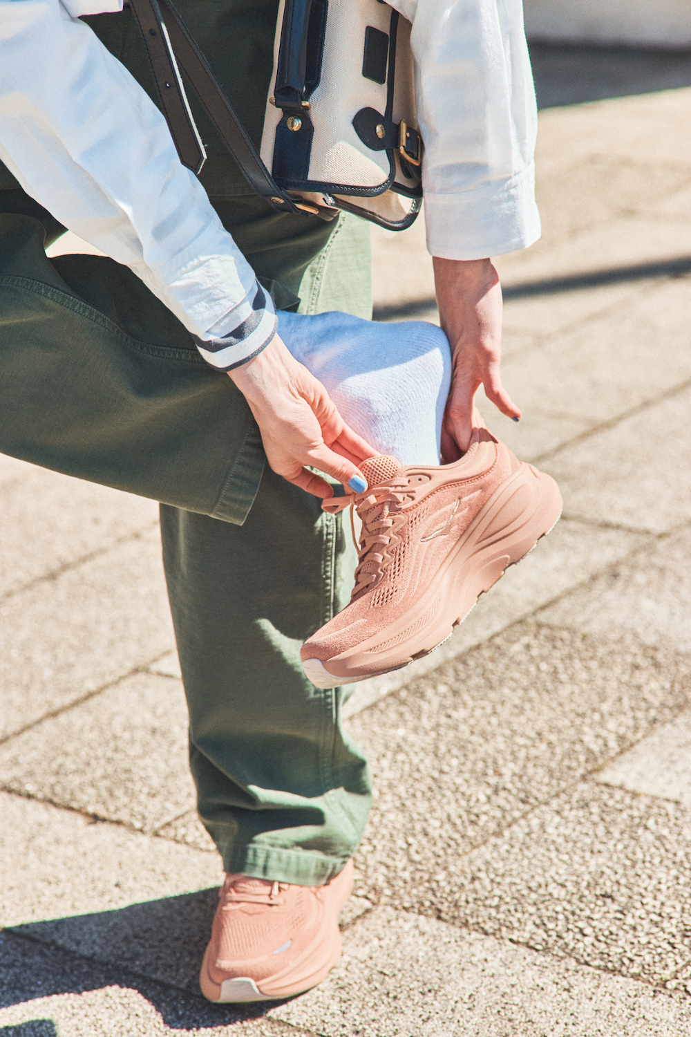 パキッとした鮮やかなカラーが多いランニングシューズの中でも、《ホカ》「ボンダイ 9」のコーラルピンクは、くすんだ色みでかなりふだん使いしやすい!ソールまでワントーンでスポーティ感が出すぎないのもいいところ。合わせるなら、同じくくすんだカーキのパンツでトーンをそろえて。白シャツやボーダー、デニムジャケットといったFUDGEらしいベーシックな服に、足元だけアクティブさを足して、いまっぽいバランスに。