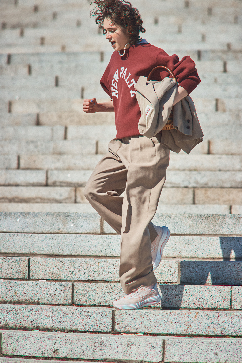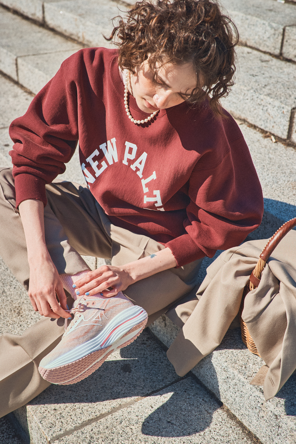 《ミズノ》で春らしいライトピンクの「ウエーブライダー 29 スーパーワイド」を発見。肌馴染みのいいピンクは、ベージュのパンツを合わせてグラデーションのように仕上げるのがおすすめ。スウェットもえんじ色を選んで、全体を暖色でまとめて。さらにインナーやソックスもシューズとトーンを揃えたピンクを選べば、足元だけが浮かないグッドバランスに。仕上げに、パールやかごバッグでレディなエッセンスを。