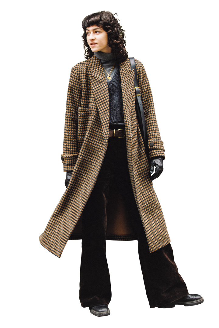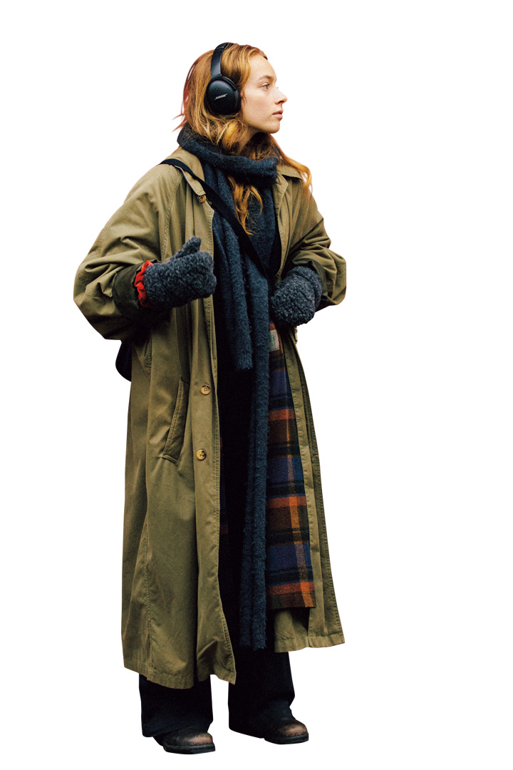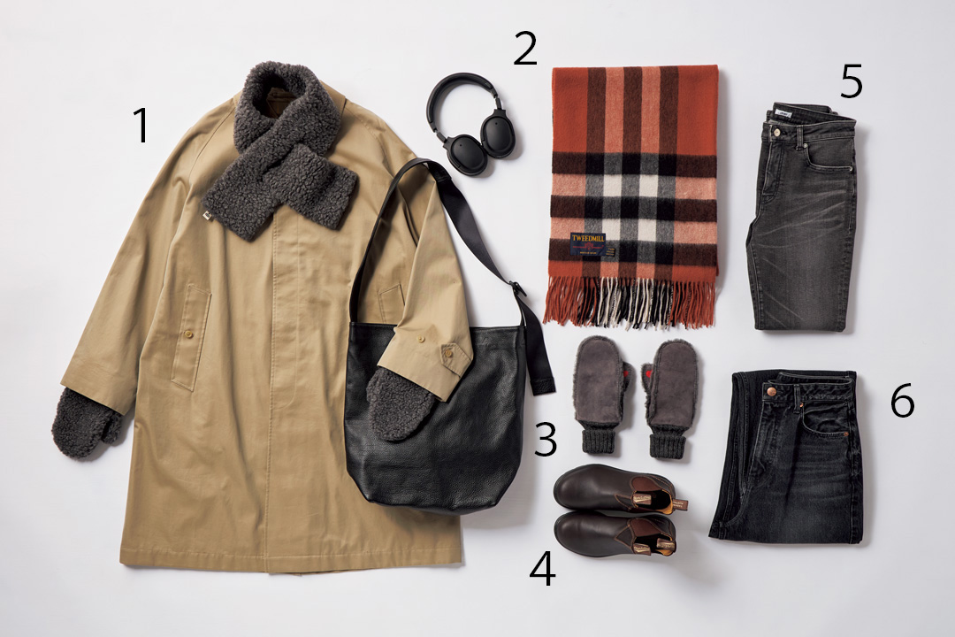 無彩色でまとめたシンプルなスタイリングなのに印象的なのはどうして ? その秘密は、モコモコの手袋&チェック柄の裏地と見た。ならば、ストールを裏地風にコートの下に流してみよう。ディテールに個性を散りばめて、オリジナリティあふれる着こなしに仕上げて。1_ コート¥132000 /ANATOMICA(アナトミカ 東京)、マフラー [H98 × W13cm]¥6490、グローブ¥5940 /ともに COLDBREAKER(セムインターナショナル)、バッグ [H39 × W28 × D15cm] ¥58300 / BLUE BLUE JAPAN(オクラ) 2_ ストール¥14960[70 × 190cm] / TWEEDMILL(セムインターナショナル) 3_グローブ¥26400 /AGNELLE(アッシュ・ペー・フランス) 4_ブーツ¥31900 / Blundstone(シードコーポレーション) 5_ デニムパンツ¥18700 /çaqü(サキュウ ルームストア) 6_デニムパンツ¥27500 / RED CARD TOKTO (ゲストリスト)