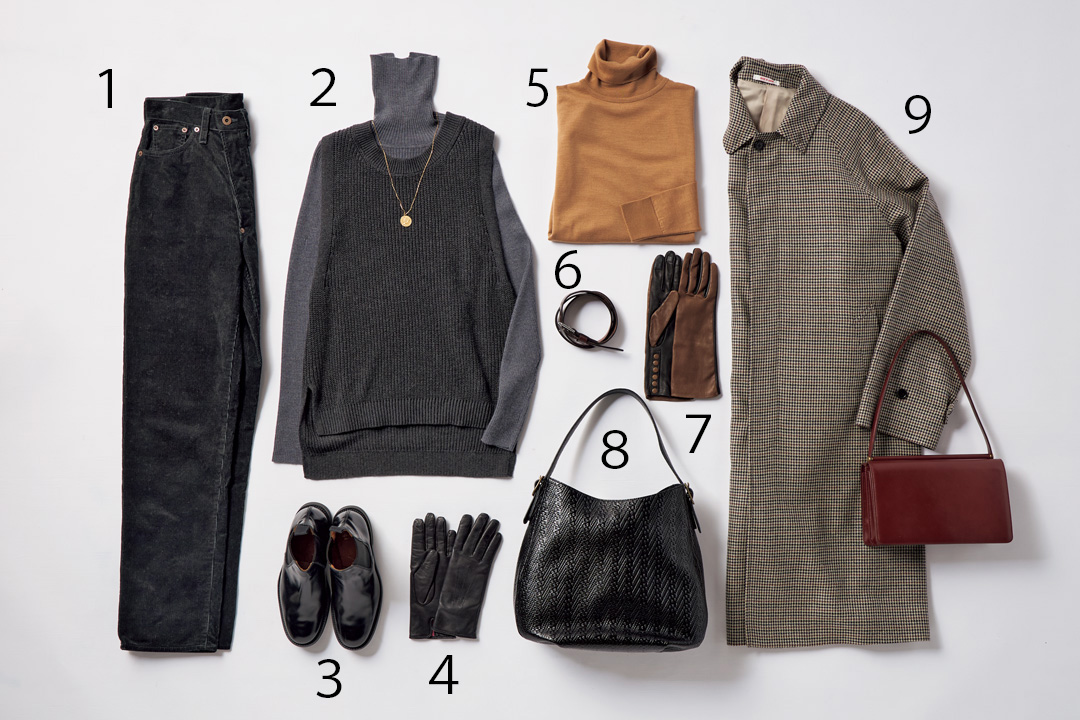 ベルト、バッグ、手袋、シューズをレザーで揃えて、ワンランク上のカジュアルへ。 1_パンツ¥36300 /ANATOMICA(アナトミカ 東京) 2_ベスト¥9900 / STATE OFMIND(ゲストリスト)、タートルネックセーター¥27500 / SLOANE(スローン)、ネックレス¥28600 / MARIHA(マリハ) 3_ブーツ¥72600 / SANDERS(サンダース ジャパン) 4_グローブ¥42900 / DENTS(真下商事) 5_ タートルネックセーター¥47300 /JOHN SMEDLEY(リーミルズ エージェンシー) 6_ベルト¥17600 /Martin Faizey(グラストンベリー ショールーム) 7_グローブ¥34760 /AGNELLE(アッシュ・ペー・フランス) 8_ バッグ [H29 × W35 × D15cm] ¥42900 / TOUT YEST(トゥティエ) 9_コート¥121000 /J.PRESS ORIGINALS(J. プレス & サンズ青山)、バッグ [H18 × W26 × D10cm] ¥43500 / TOUT Y EST(トゥティエ)