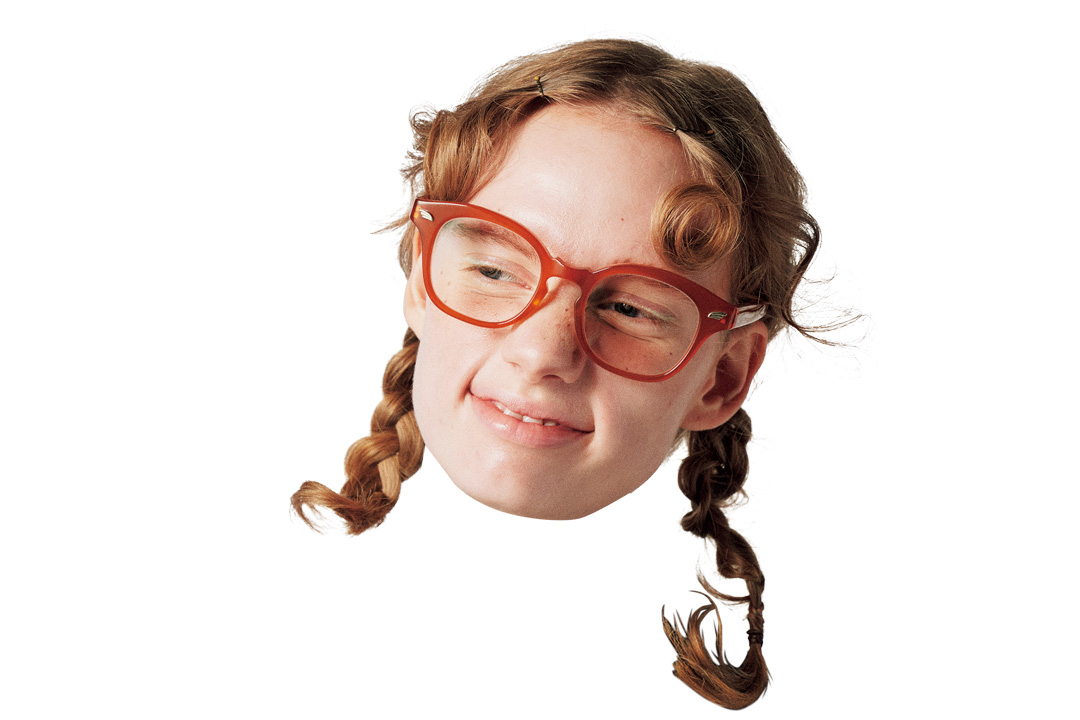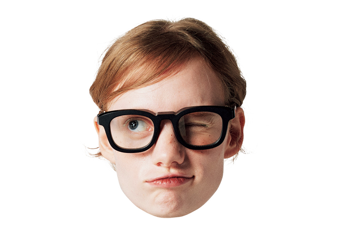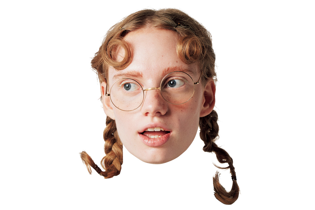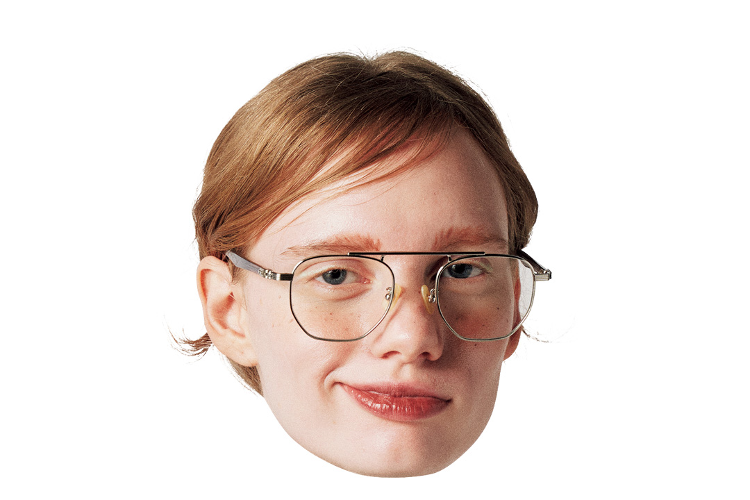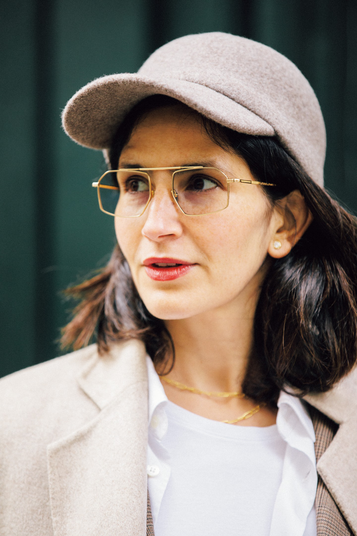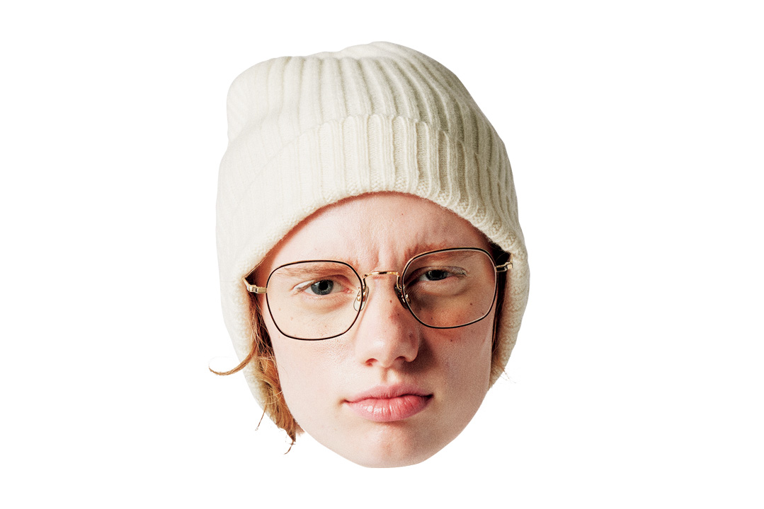 今どきな表情をつくってくれる、ビッグシェイプのメタルフレーム。¥28600[レンズ込み価格](パリミキ お客様センター)、ニット帽¥8800 / Wax London(グリニッジ ショールーム)
