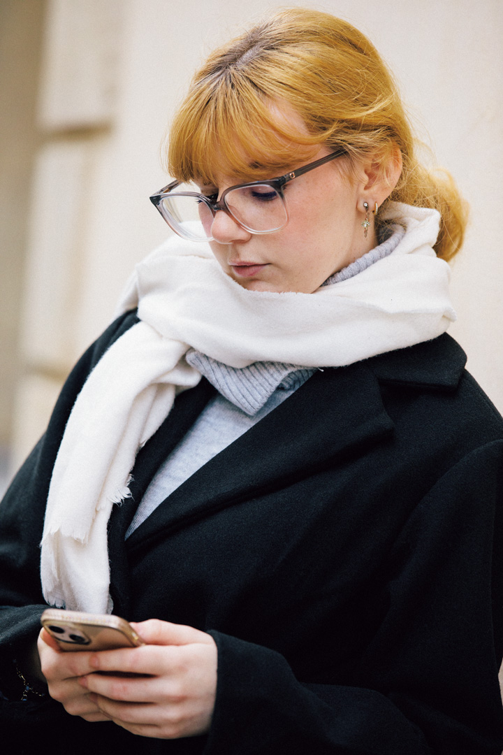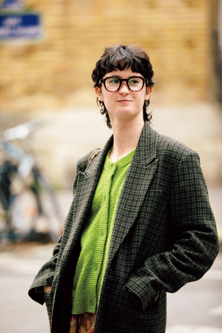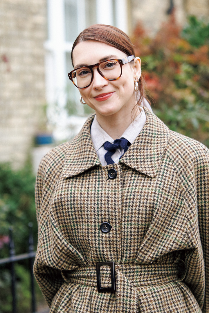 チェックコートとビッグフレームが相性抜群。英国製メガネブランド《キュービッツ》より。