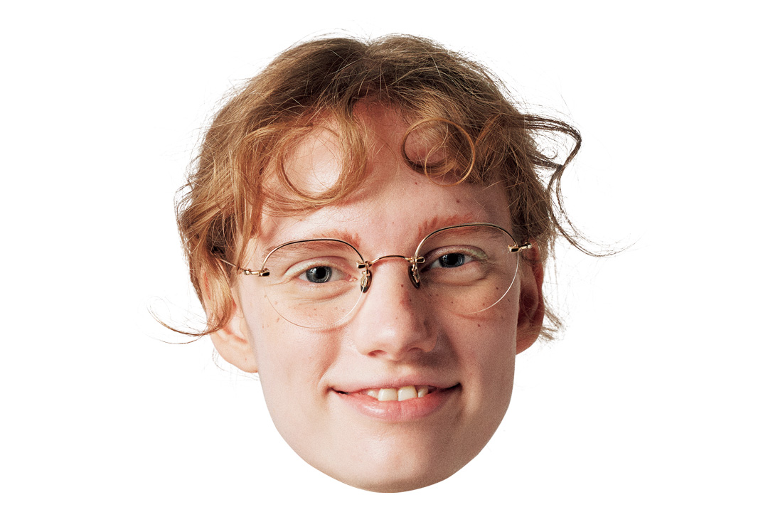 グレイッシュなマッシュルームヘアと丸メガネがアーティスティックな表情を演出する。