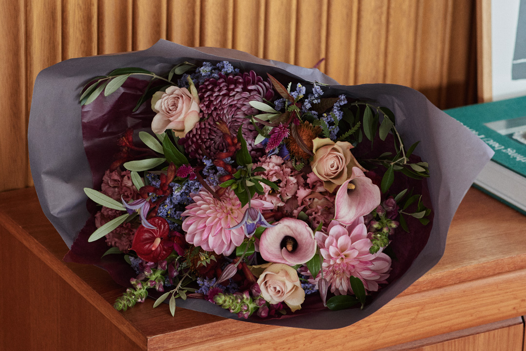 愛知・名古屋に拠点を構える〈フラワーノリタケ〉から届いたのは、伸び伸びとした植物の動きそのものを束ねたような、躍動感のある花束。シックで大人っぽい雰囲気のジャンルが得意なお店で、珍しい品種を多く扱うことも人気の所以。手にすれば、「このお花はなんだろう? 」と、自然と植物にも興味が湧いてくる。¥11000