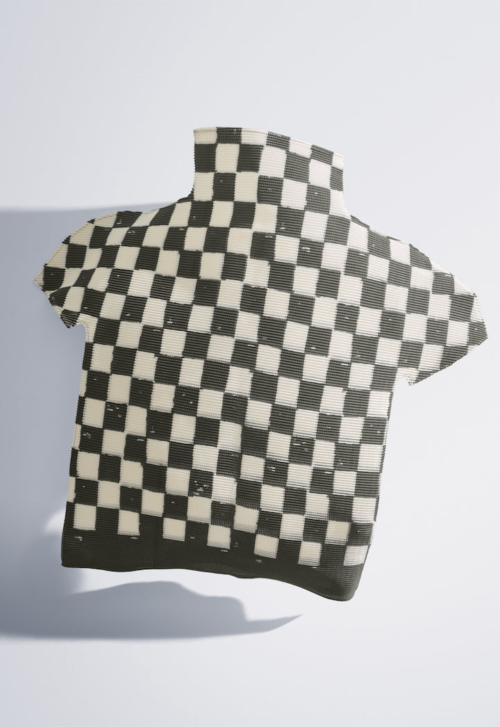 消しゴムの版で市松模様を描いた、力強さと柔らかさを併せ持つ柄のストレッチプリーツ。近くで見ると版ならではの風合いが表現され、味のある一枚に仕上がっています。