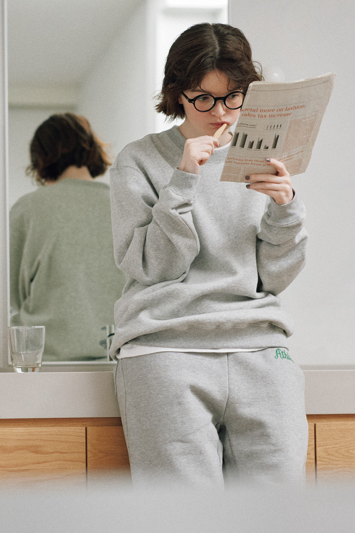 スウェットシャツ¥5990 / Gap(ギャップ)、スウェットパンツ¥14300 / SANDINISTA(ダイバーズシティ)、Tシャツ¥8800 /ANATOMICA(アナトミカ 東京)、メガネ¥19800 / THE BEDFORDHOTEL(キングスター)