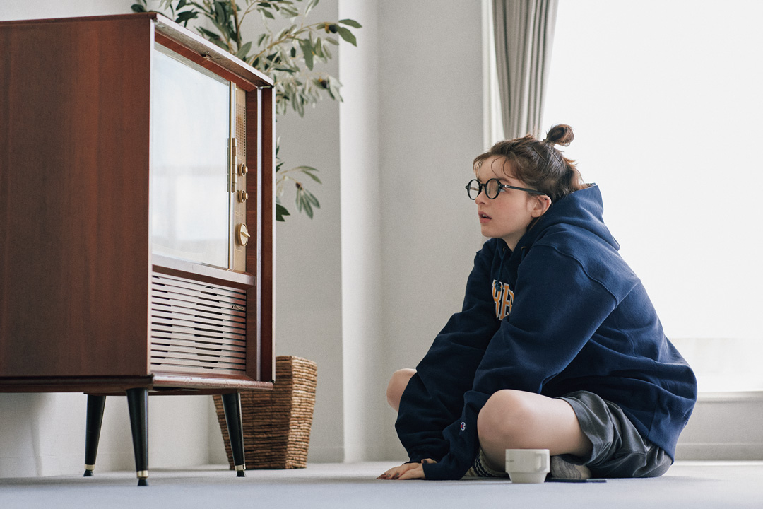 「いけない!もうこんな時間」そう言うと、ご主人はテレビの前に座り込んでじっと動かない。急に立ち上がったかと思えば、せっせとお着替え。「ピンクを目立たせるには……」ブツブツ言いながら、ジャンプスーツの袖部分をキュッと腰で結んで、セーターをかぶる。