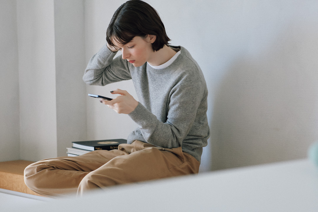 グレーのセーターとベージュのチノパンで、本日のコーディネートはフィックス。と思いきや、スマートフォンをいじってからまた着替えを始めた。おそらくイエローがラッキーカラーなんだろう。同色のマフラーを合わせたり、マスタードなアイラインを引いたり、細部のオシャレにだって僕は気付いているよ。