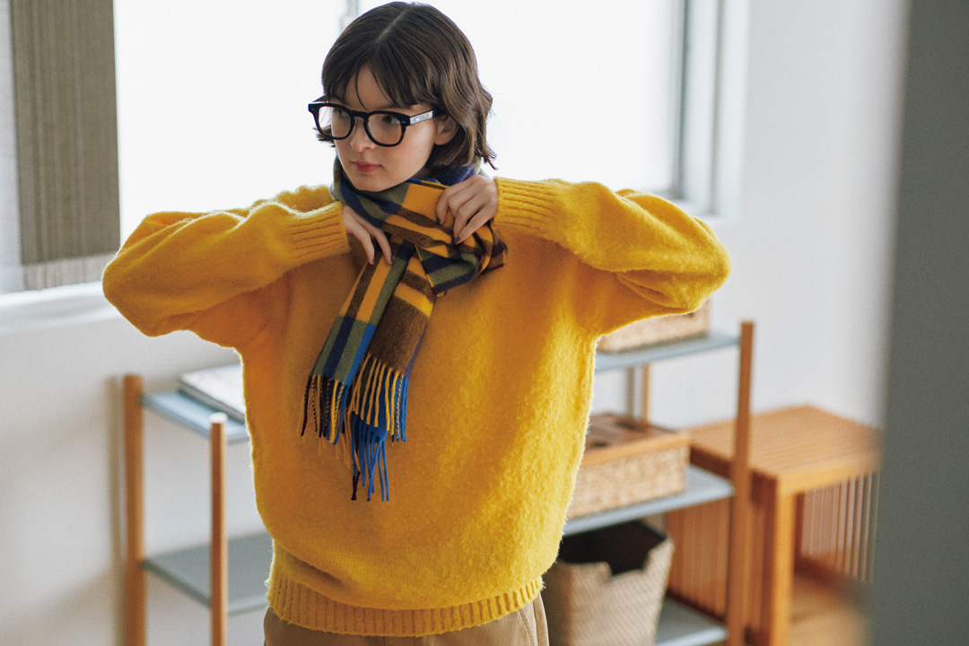 セーター¥31900 /Shetland Woollen Co. (グラストンベリーショールーム)、パンツ¥12100 / L.L.Bean(エル・エル・ビーンカスタマーサービスセンター)、マフラー¥52800/Joshua Ellis(グリニッジ ショールーム)、メガネ¥19800/ THE BEDFORD HOTEL(キングスター)