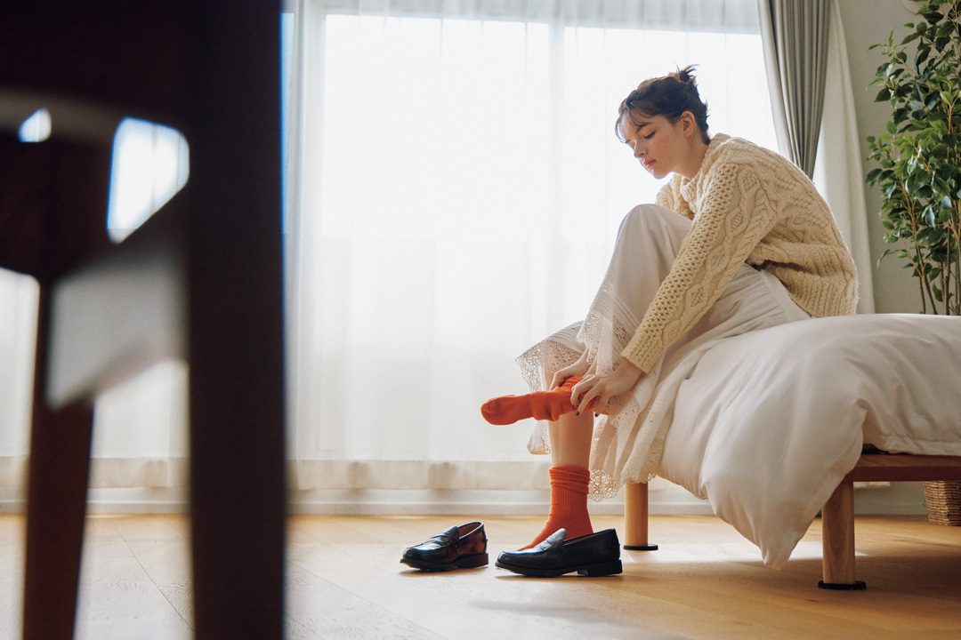 セーター¥57200 / THISISASWEATER. (ヨネトミストア)、スカート¥39600 / Bilitis dix-septans(ビリティス)、ソックス¥3080 /AMERICANTRENCH(メイデン・カンパニー)、シューズ¥70400/ SANDERS(サンダース ジャパン)
