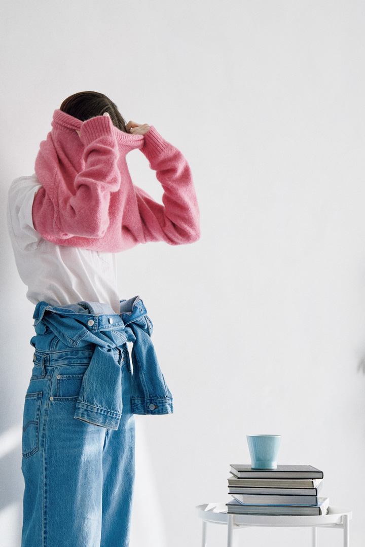 セーター¥25000 / Sézane(セザンヌ)、Tシャツ¥8800/ANATOMICA(アナトミカ 東京)、ジャンプスーツ¥17600/Levi’s® (リーバイ・ストラウス ジャパン)