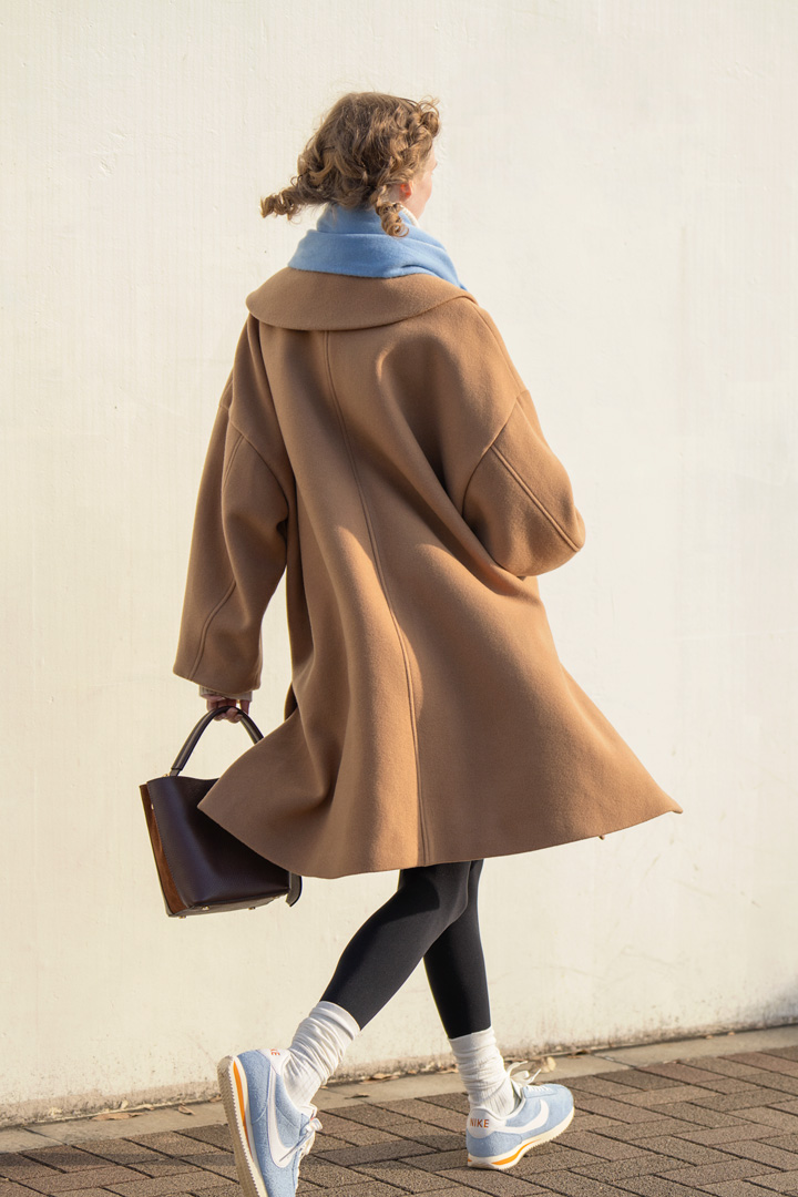 コート¥48400/MANON(エムケースクエア)、中に着たセーター¥39600/SLOANE(ザ ショップ スローン 新静岡セノバ店)、ストール¥93500/JoshuaEllis(グリニッジ ショールーム)、バッグ¥18700/AULENTTI(セムインターナショナル)、シューズ¥13530/NIKESPORTSWEAR(ナイキ カスタマーサービス)、その他/スタイリスト私物