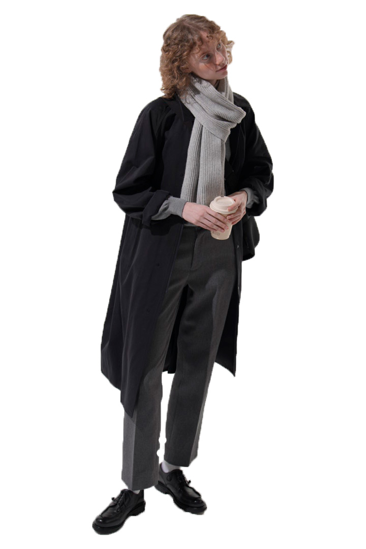 グレーとネイビーも好相性。インナーはグレーの濃淡でまとめて、ネイビーのバルマカーンで覆う。足元を黒のシューズで引き締めれば、マニッシュなパンツスタイルの出来上がり。