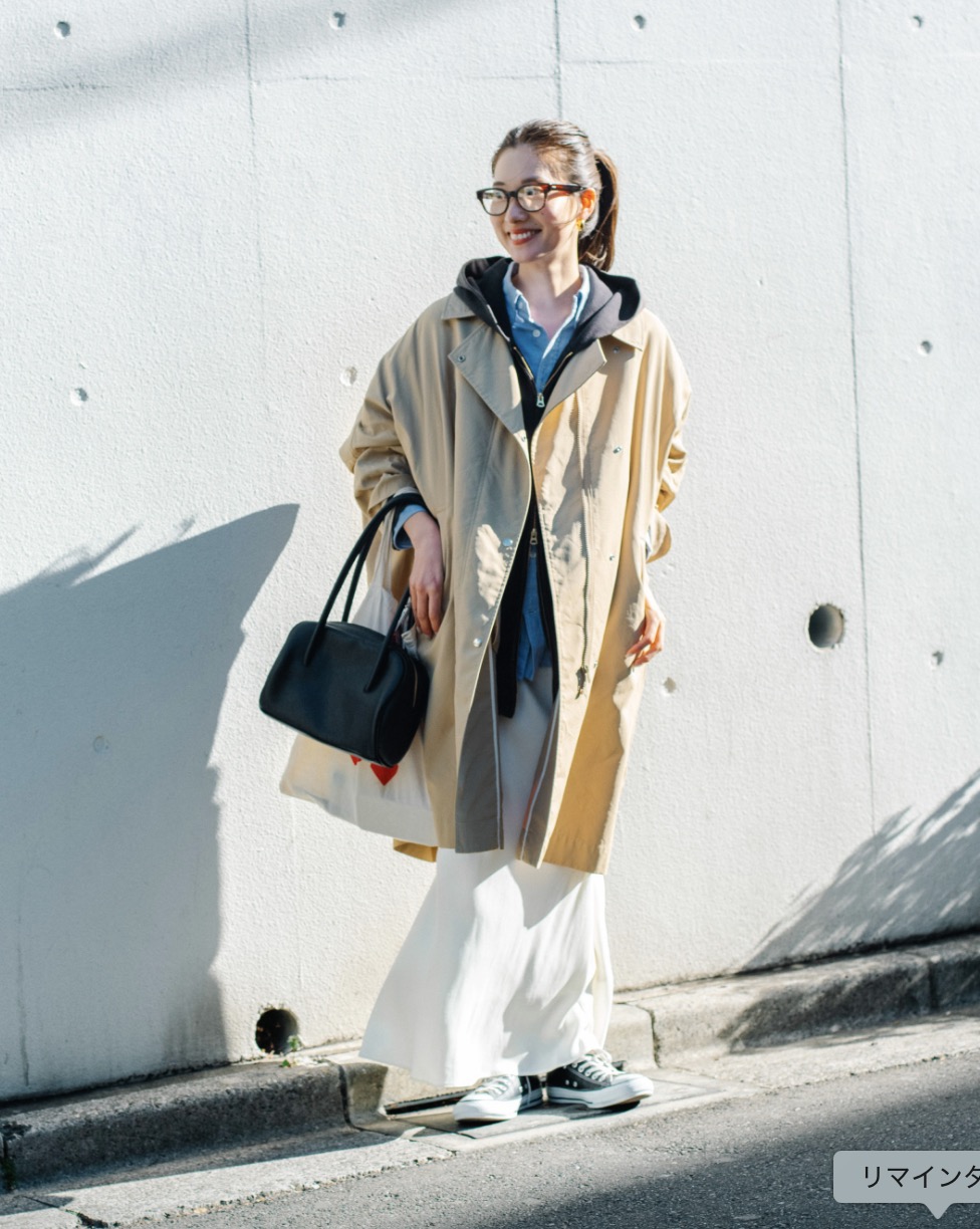 - 4 第3位:スプリングコートはパーカーと重ね着して春を先取り♪ホワイトのスカートで抜け感も◎