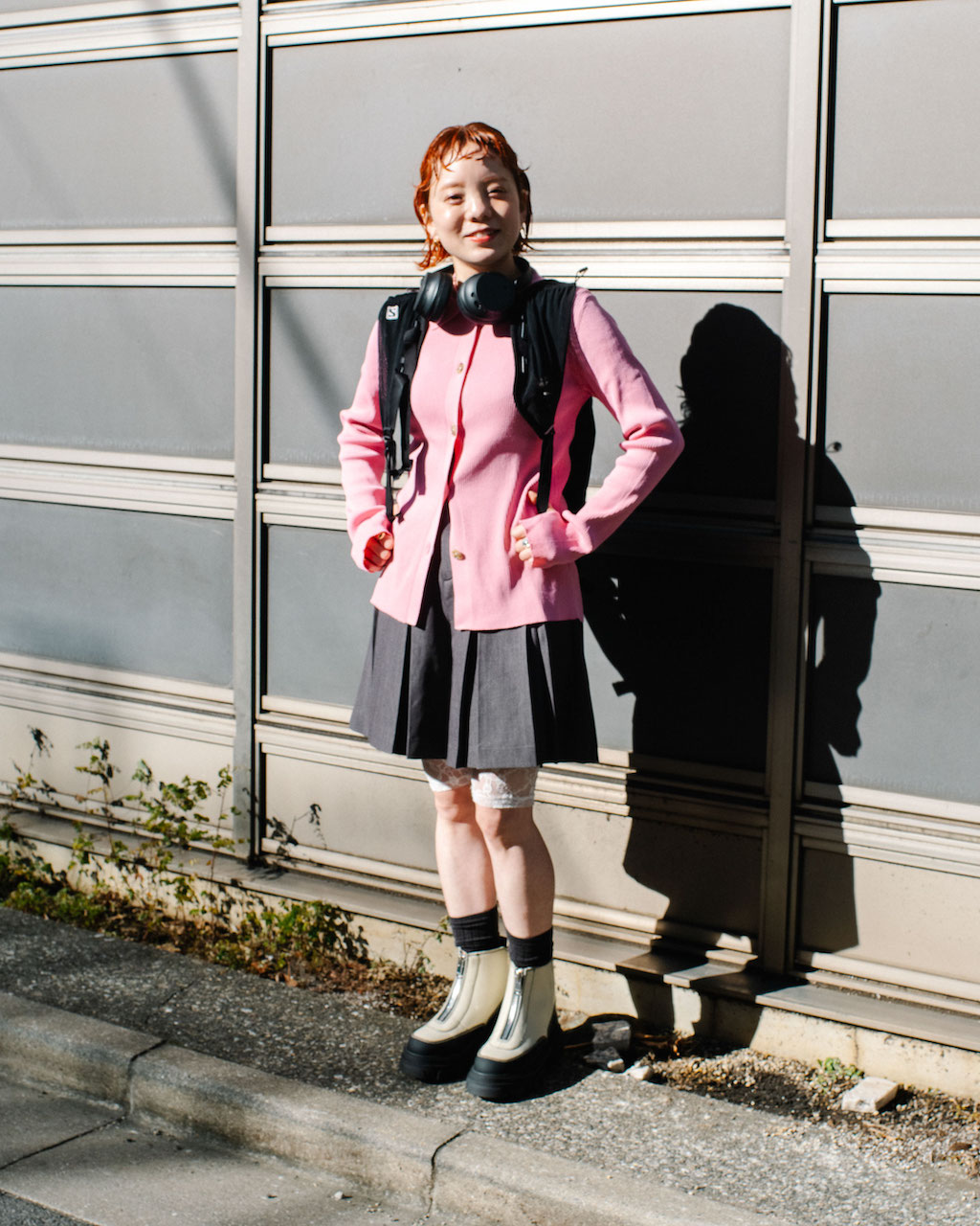 ▶︎鮮やかなピンクのトップスで春を先取り!ヘッドホンもおしゃれのアクセントに