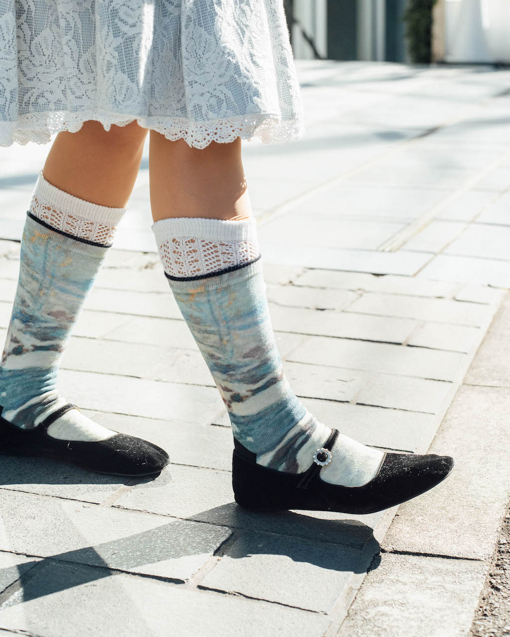 ブラックより軽やかに見えるグレーを基調にした寒色コーデなら、ガーリーなレーススカートも甘くなりすぎず着こなせる。重ねばきした個性的なプリントソックスが無地コーデに映える。