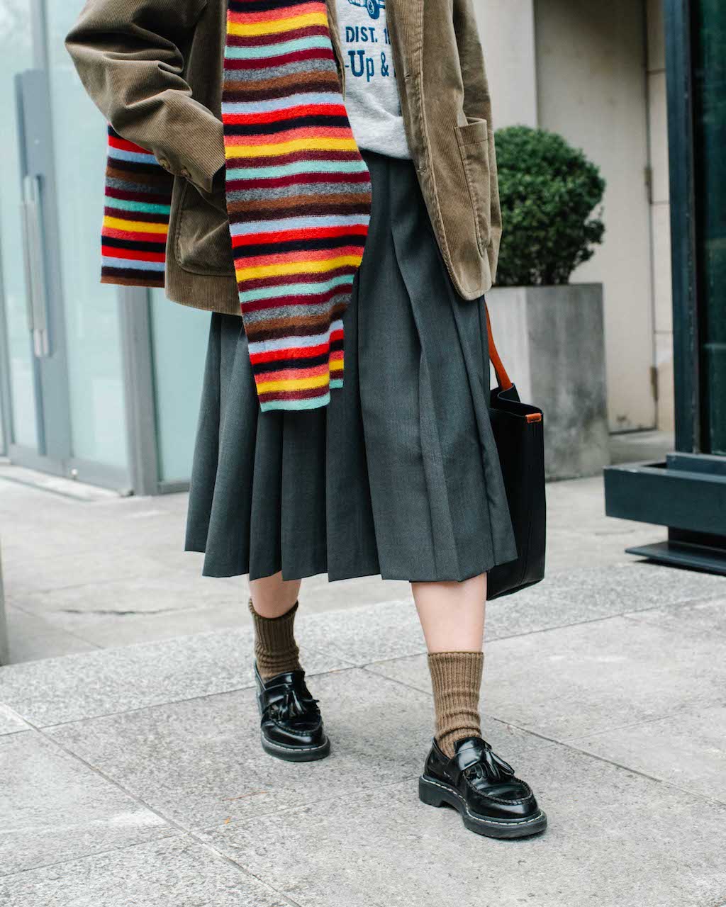 ▶︎ジャケットとプリーツスカートでスクールガール風に、マルチカラーのボーダーをアクセント