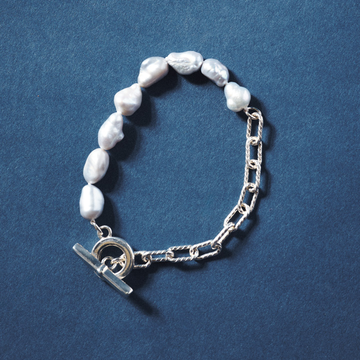 袖口にチラ リ、チェーンとグレーの淡水パールを用いたブレスレットを。