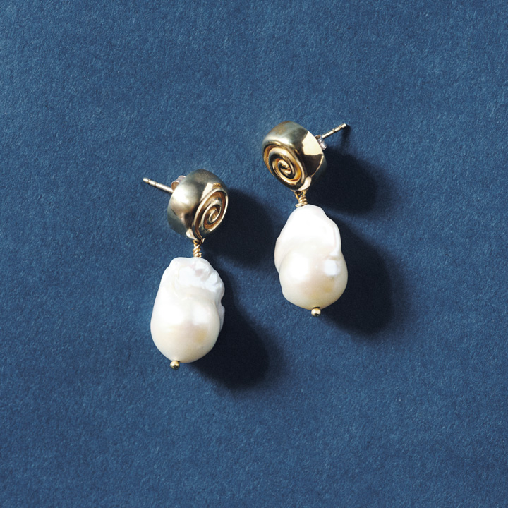 パールのピアスは、表情を華やかに彩ってくれ る。