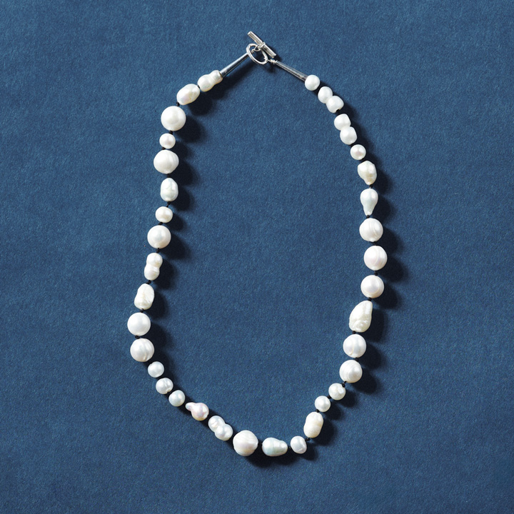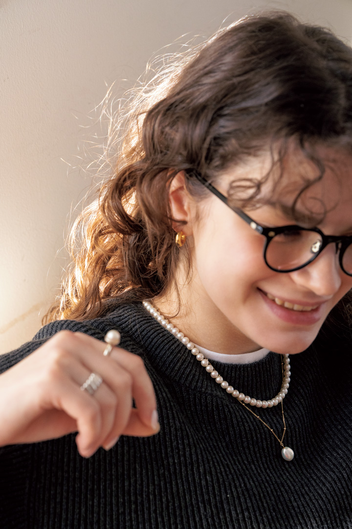 パールネックレス¥22000/CHERRYBROWN(チェリーブラウン)、一粒パールネックレス¥24200/MARIHA(マリハ)、パール付きリング¥20900/PLOW(プラウ)、シルバーリング¥11000/DAUGHTERSJEWELRY(ドーターズジュエリー)、ピアス¥9900/GAGAN(ガガン)、メガネ¥93500/10 eyevan(コンティニュエ)、セーター¥110000/BATONER(バトナー)、中に着たTシャツ[2P]¥3520/Hanes(ヘインズブランズジャパン カスタマーサービス)