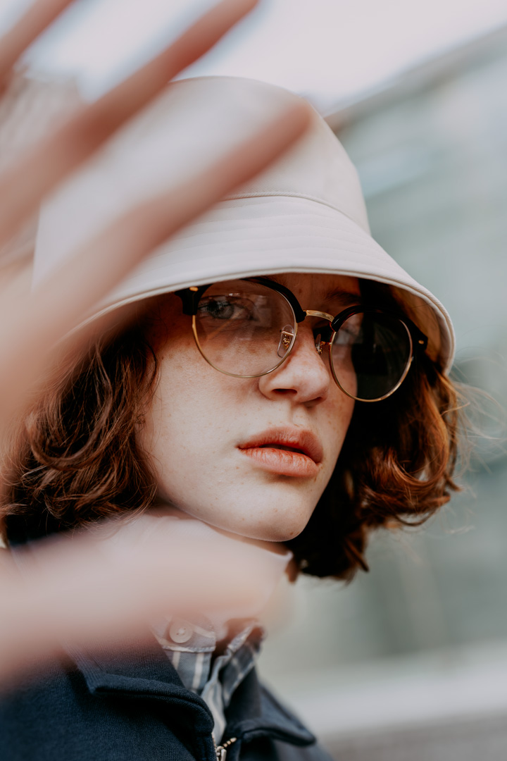 ニコニコANAちゃんは、どこへやら。目深に被ったバケットハットと知性香るブローメガネの先には、シリアスフェイスがのぞいている。