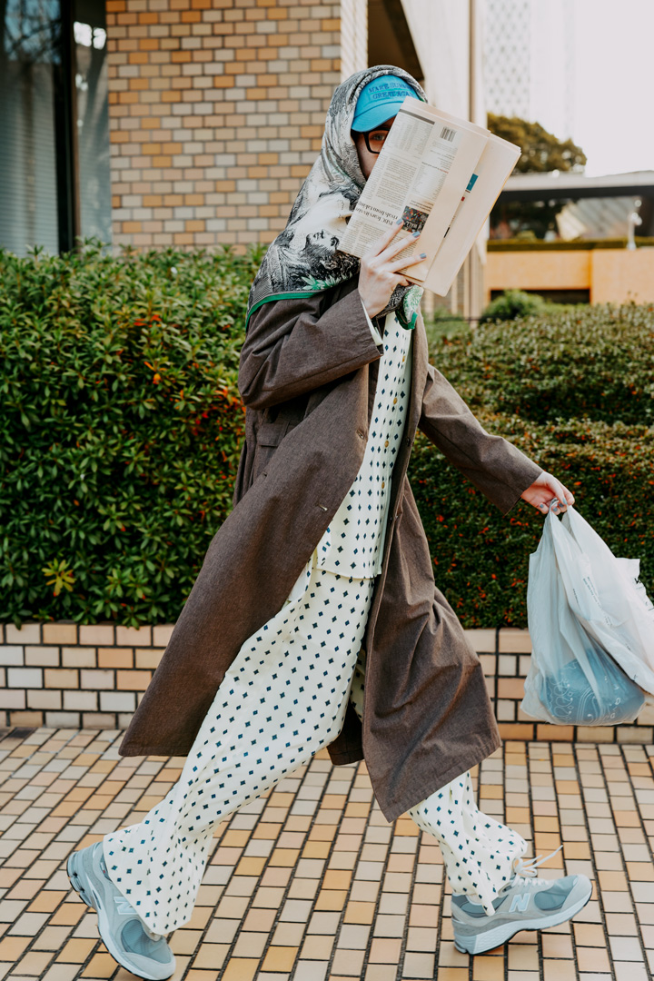 スカーフ¥38280/INOUI EDITIONS(アッシュ・ペー・フランス)、キャップ¥7260/Adult Oriented Robes(イルイマジン ランドスケープ)、メガネ¥29700/QWON(シンゾーン ルミネ新宿店)、、コート¥53900/nanamica(ナナミカ D.W.S.)、パジャマシャツ¥36300、パジャマパンツ¥35200/ともにTHE SHINZONE(シンゾーン ルミネ新宿店)、スニーカー¥26400/New Balance(ニューバランスジャパンお客様相談室)