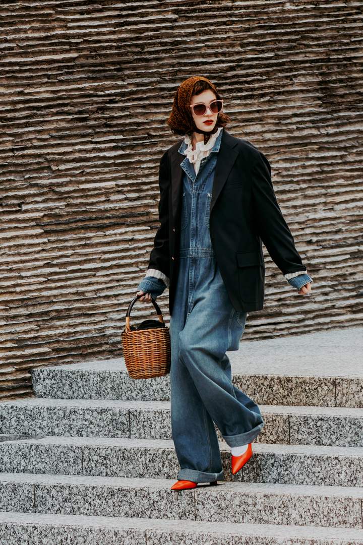 ハット¥57200、バラクラバ¥33000/ともにKIJIMA TAKAYUKI(キジマ タカユキ)、メガネ¥26400/THEBEDFORD HOTEL(キングスター)、ジャケット¥44000/DRESSTERIOR( ドレステリア 渋谷スクランブルスクエア店)、オーバーオール¥18700/BIGMAC × BEAMSBOY(ビームス ボーイ 原宿)、Tシャツ¥7480/GOODROCK SPEED×BEAUTY&YOUTH(ビューティ&ユースユナイテッドアローズ 丸の内店)、バッグ¥11000/L.L.Bean(エル・エル・ビーン カスタマーサービスセンター)、シューズ¥64900/SANDERS(サンダース ジャパン)