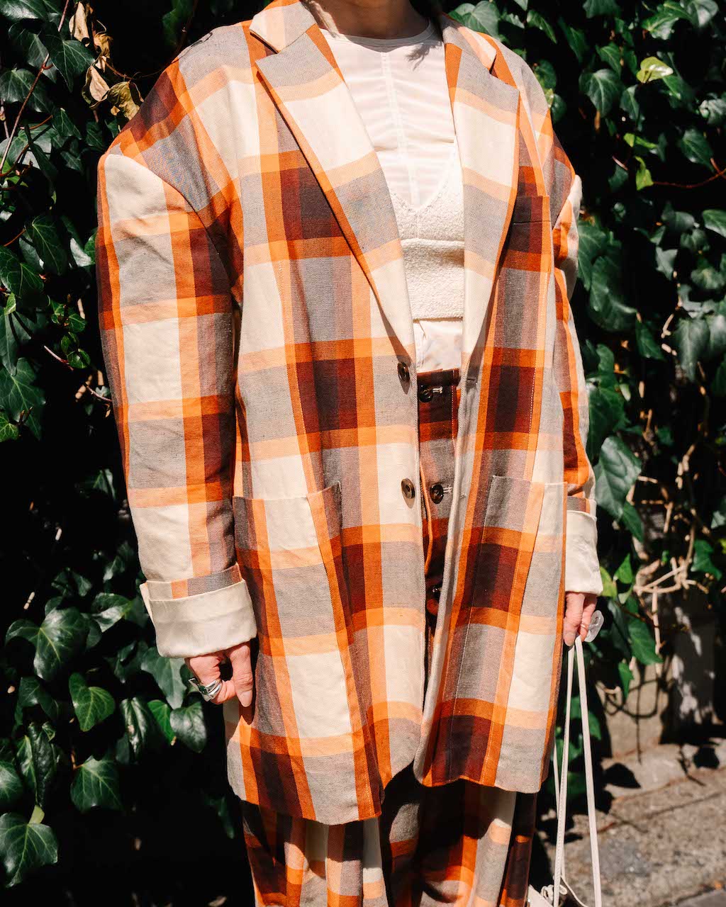 あたたかみのあるオレンジをベースにしたチェック柄ジャケット&パンツのセットアップがお洒落。オーバーシルエットのジャケットも面白い。白いインナーや白小物で程よい抜け感を引き出す。