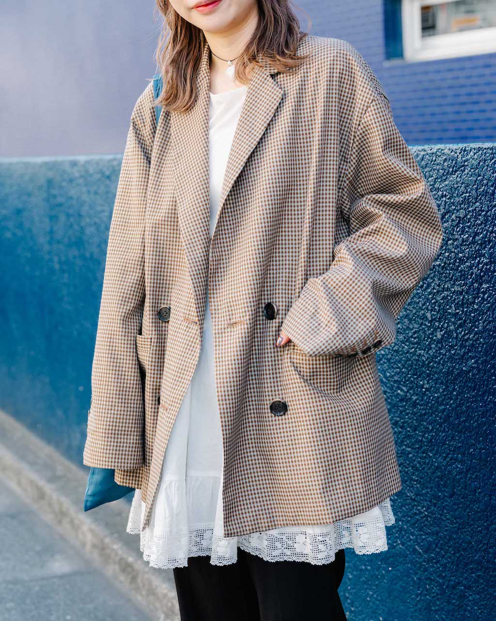 コーディネート5:ゆったりジャケットからのぞくレーススカートが愛らしい