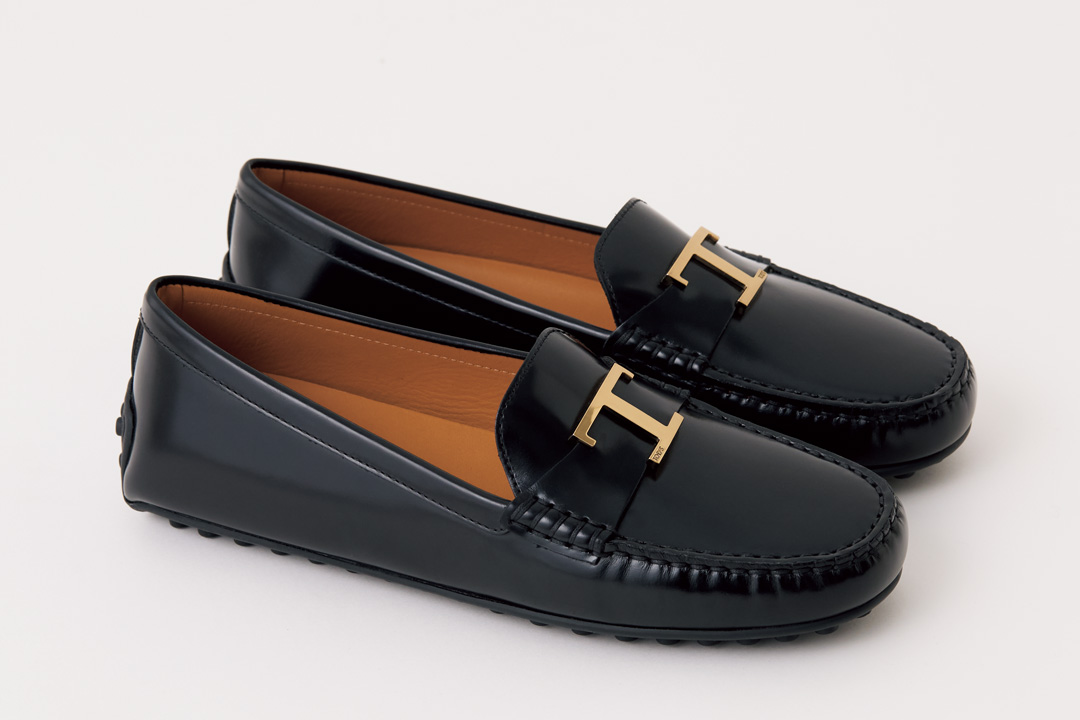 “T”のメタルアクセサリーが上品に煌めくローファーは、《トッズ》の創業とともに発表されたという「ゴンミーニ」由来の1 足。オードリー・ヘプバーンにはじまり、ダイアナ妃やアン・ハサウェイなど、名だたる著名人が愛したことでも有名。そんなタイムレスな魅力を放つ同シリーズの特徴はやっぱり靴底の「ラバー ペブル」。一足ずつ職人による手作業で施され、快適な履き心地を叶えるとともにシグニチャーになっている。シューズ¥113300 / TOD’S(トッズ・ジャパン)