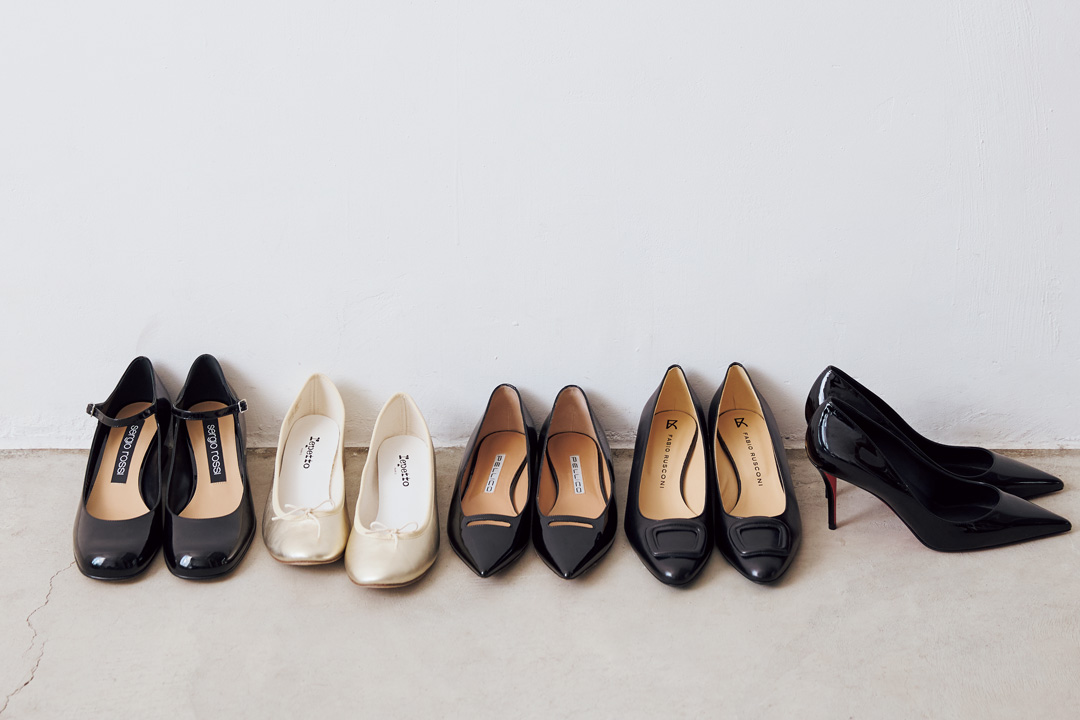 1_1951 年にイタリアでスタートした《セルジオ ロッシ》のパテントレザーのメリージェーン。なめらかな曲線を描く「スカルプテッドヒール」は見た目が美しいうえ、チャンキーヒールのように安定感があって歩きやすい。[H4.5cm] ¥97900/Sergio Rossi(セルジオ ロッシ カスタマーサービス) 2_《レペット》のアイコン「バレリーナ」に、高さ3cm のミドルヒールが加わったのがこちらの「カミーユ」と呼ばれるモデル。メタリックカラーは装いの小粋なアクセントに。[H3cm] ¥63800 / Repetto(ルックブティック事業部) 3_《ペリーコ》は、エレガントなデザインと鮮やかな色使いが魅力。アイコンシリーズの「アネッリ」は、ポインテッドトゥが凛とした強い女性像を演出してくれる。[H1cm] ¥69300 / PELLICO(アマン) 4_レザーのスクエアバックルが印象的なパンプス。イタリア・フィレンツェ 在住のシューズデザイナー、ファビオ・ルスコーニが自身の名を冠して1998 年にスタートしたシューズブランドからピックアップ。[H4cm]¥37400 / FABIO RUSCONI(伊勢丹新宿本店 本館2 階 婦人靴)5_《クリスチャン ルブタン》特有の「レッド・ソール」が足元にレディの品格を添える。メゾンの新定番として注目を集める「ミス Z」は、ヒールの高さを4 種類から好きに選べる。[H8cm] ¥134200 / ChristianLouboutin(クリスチャン ルブタン ジャパン)