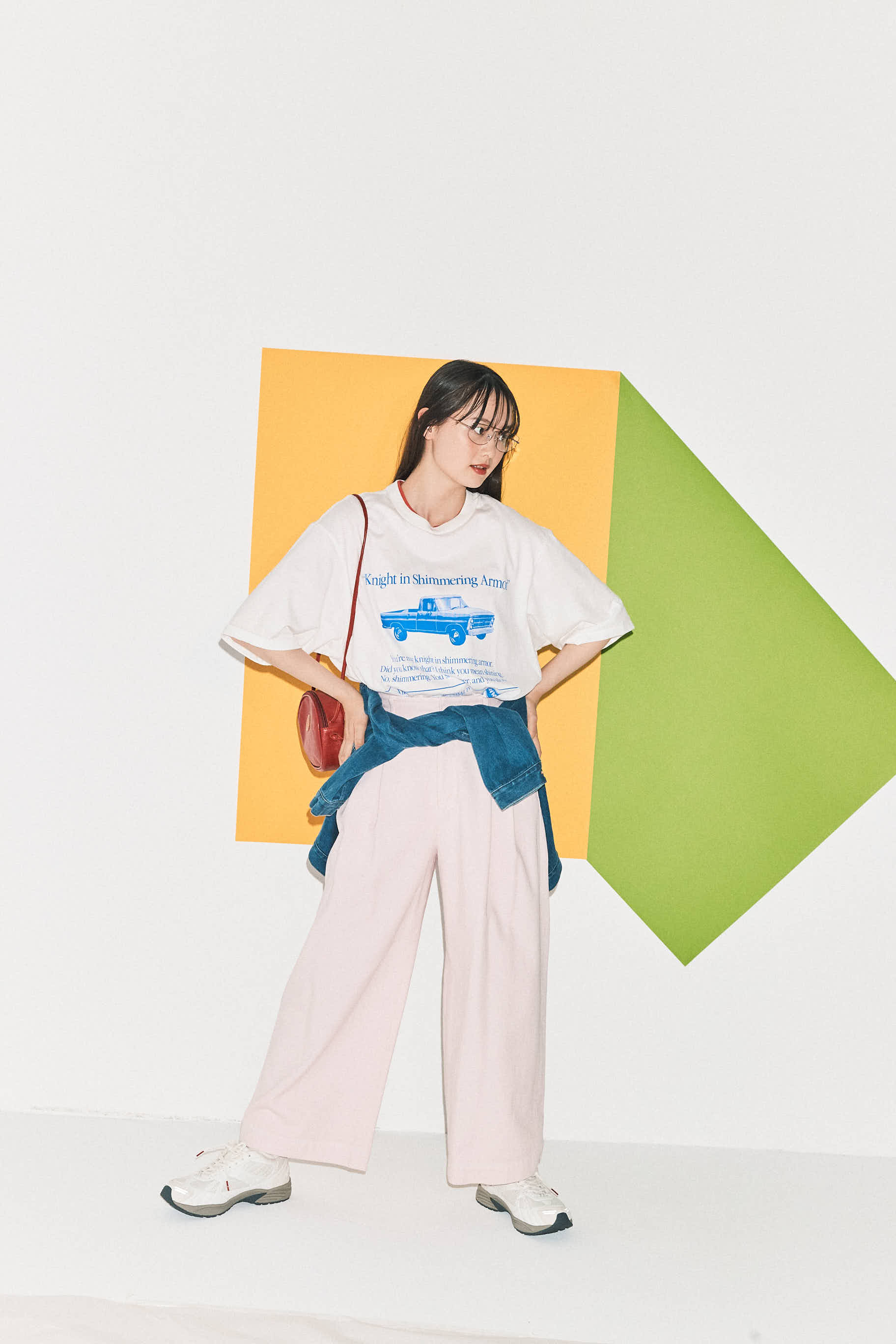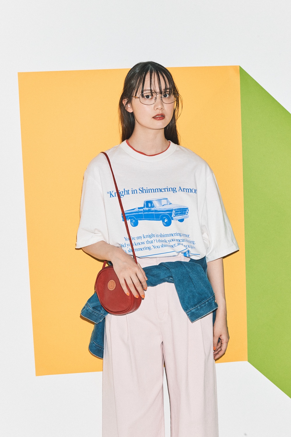 若き日のジョニー・デップとレオナルド・ディカプリオの好演がいまも心に残る、名作映画『ギルバート・グレイプ』からインスパイアされたTシャツ。どこか懐かしい雰囲気のプリントは、主人公・ギルバートの愛車。こっそりバッグと合わせた赤のTシャツを重ねているところも注目。淡いピンクのスラックスパンツできちんと着こなしたい。