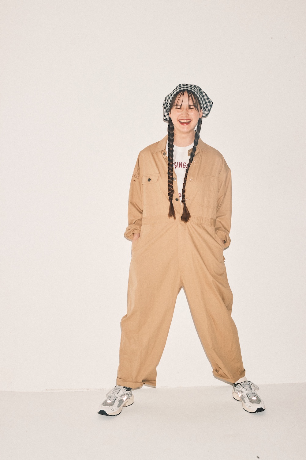 Tシャツ¥8800 / MACPHEE(トゥモローランド)、オールインワン¥25300 / PAYDAY for JOURNAL STANDARD(ジャーナルスタンダード 自由が丘店)、バブーシュカ¥3300 / OVERRIDE(オーバーライド 神宮前)、シューズ¥16940 / New Balance(ニューバランスジャパンお客様相談室)