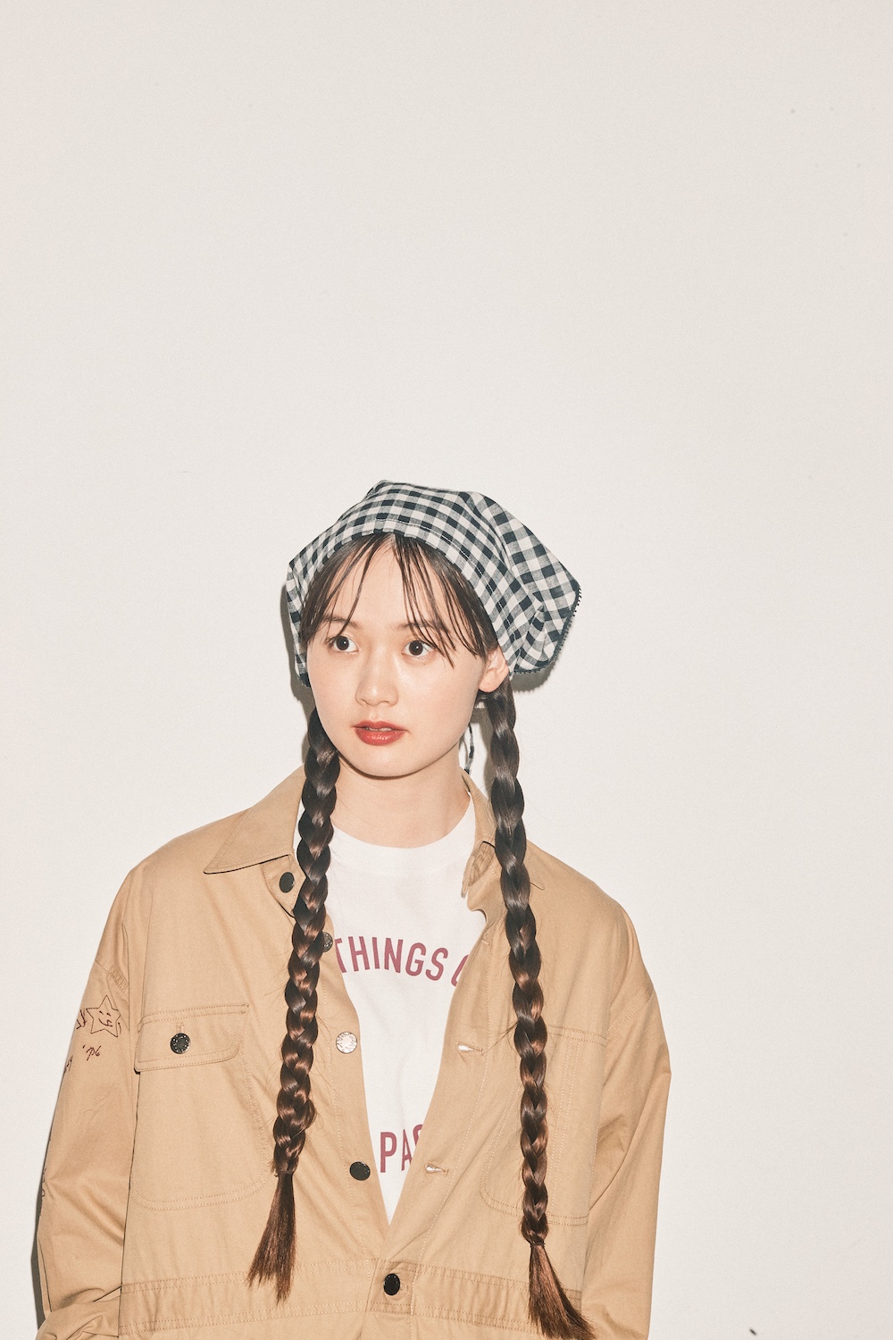 オールインワンは一枚で着るというより、重ねて楽しむもの。だからこそ、チラリと見せるTシャツにはこだわりたい。《MACPHEE》定番の天竺編みTシャツには、「GOOD THINGS COME IN SMALL PACKAGES」の文字がプリント。”小さくても中身が大事”という意味があり、見た目で判断してはいけないという、グッとくるメッセージが込められている。バブーシュカで女の子ぽく、でも足元はスポーティに仕上げて。