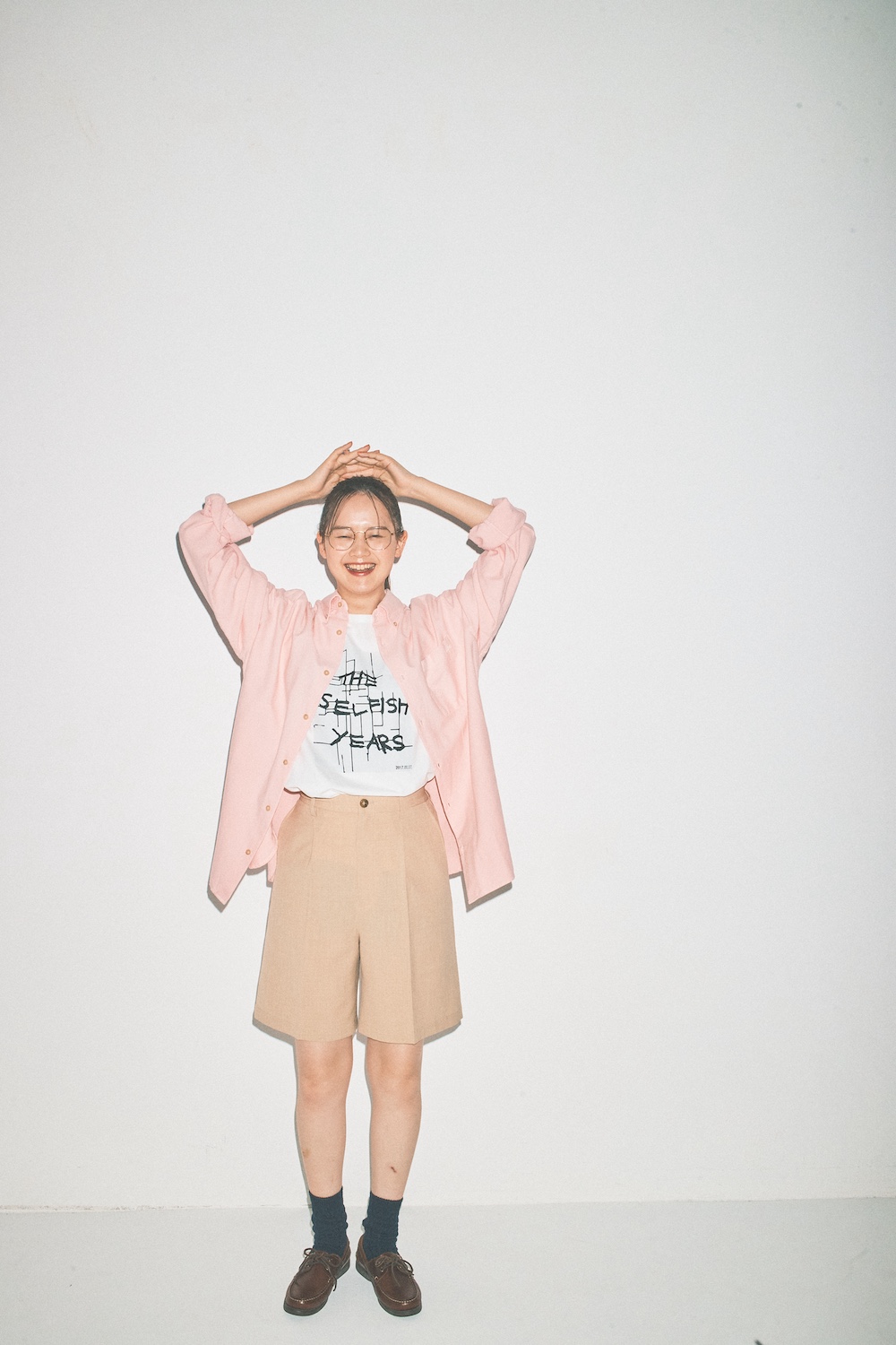 Tシャツ¥15400 / agnès b.(アニエスベー)、シャツ¥39600 / A.P.C.(アー・ペー・セー カスタマーサービス)、ショートパンツ¥6545 / FREAK’S STORE(フリークス ストア渋谷)、メガネ¥25740 / Ray-Ban(ルックスオティカジャパン カスタマーサービス)、ソックス¥4180 / PANTHERELLA(真下商事)、シューズ¥44000 / Paraboot(パラブーツ青山店)
