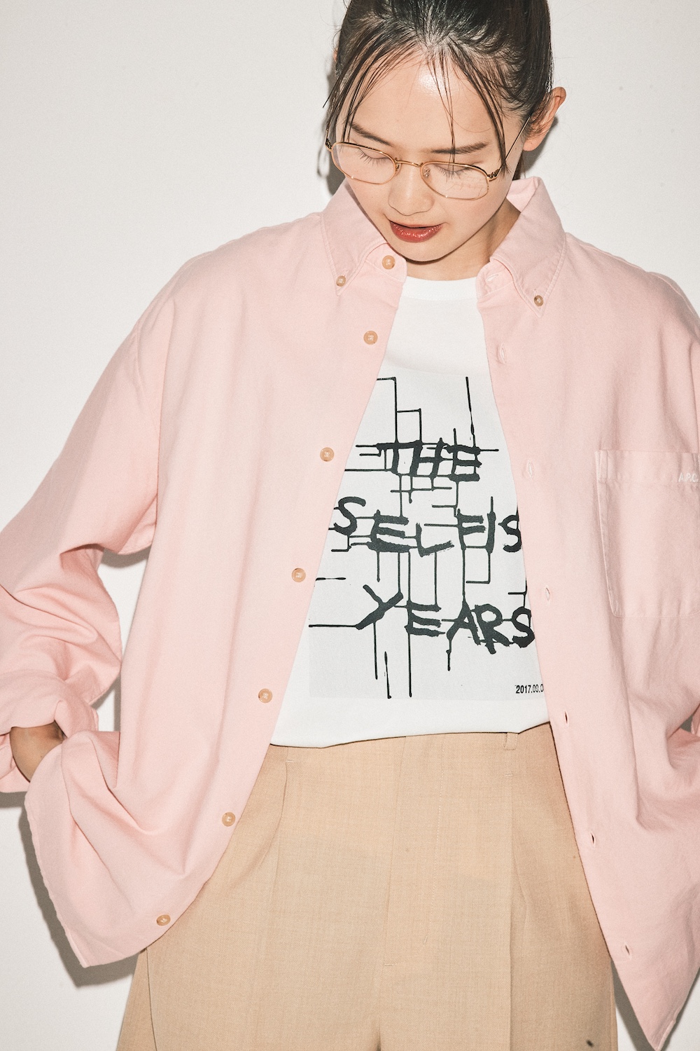 アートなデザインのTシャツは1枚で着るよりも、シャツからちらり覗かせた方が大人っぽく着れる。このとき大切なのは、ペールトーンでまとめること。インパクトあるデザインだからこそ、淡い色で中和させて。ハーフパンツもクラシックなタック入りなら子供ぽくならなくて◎。
