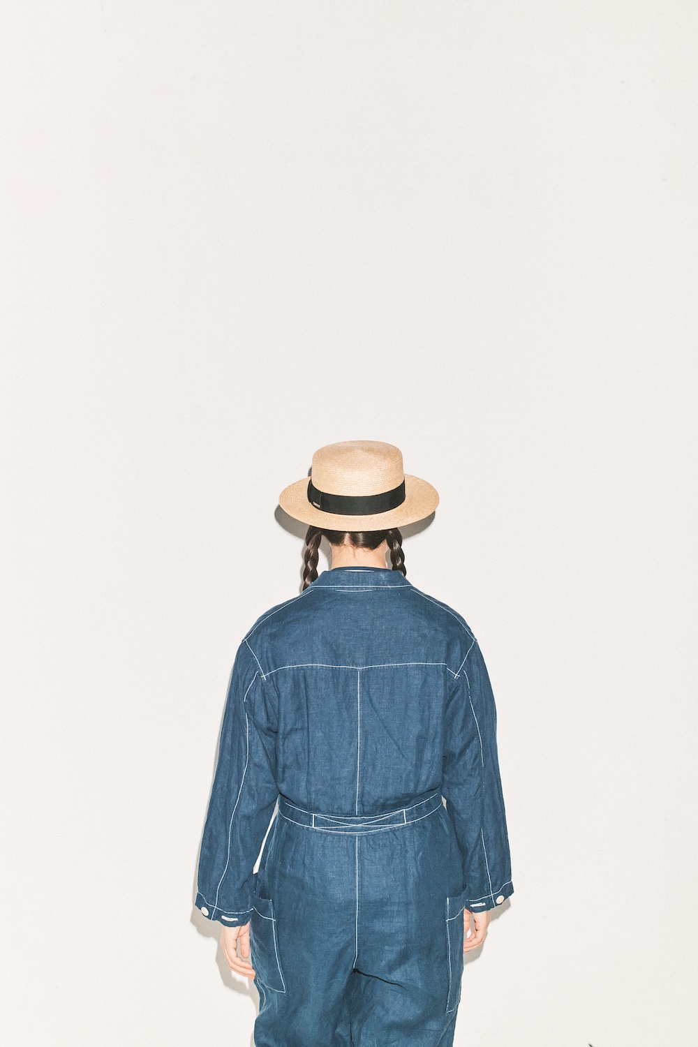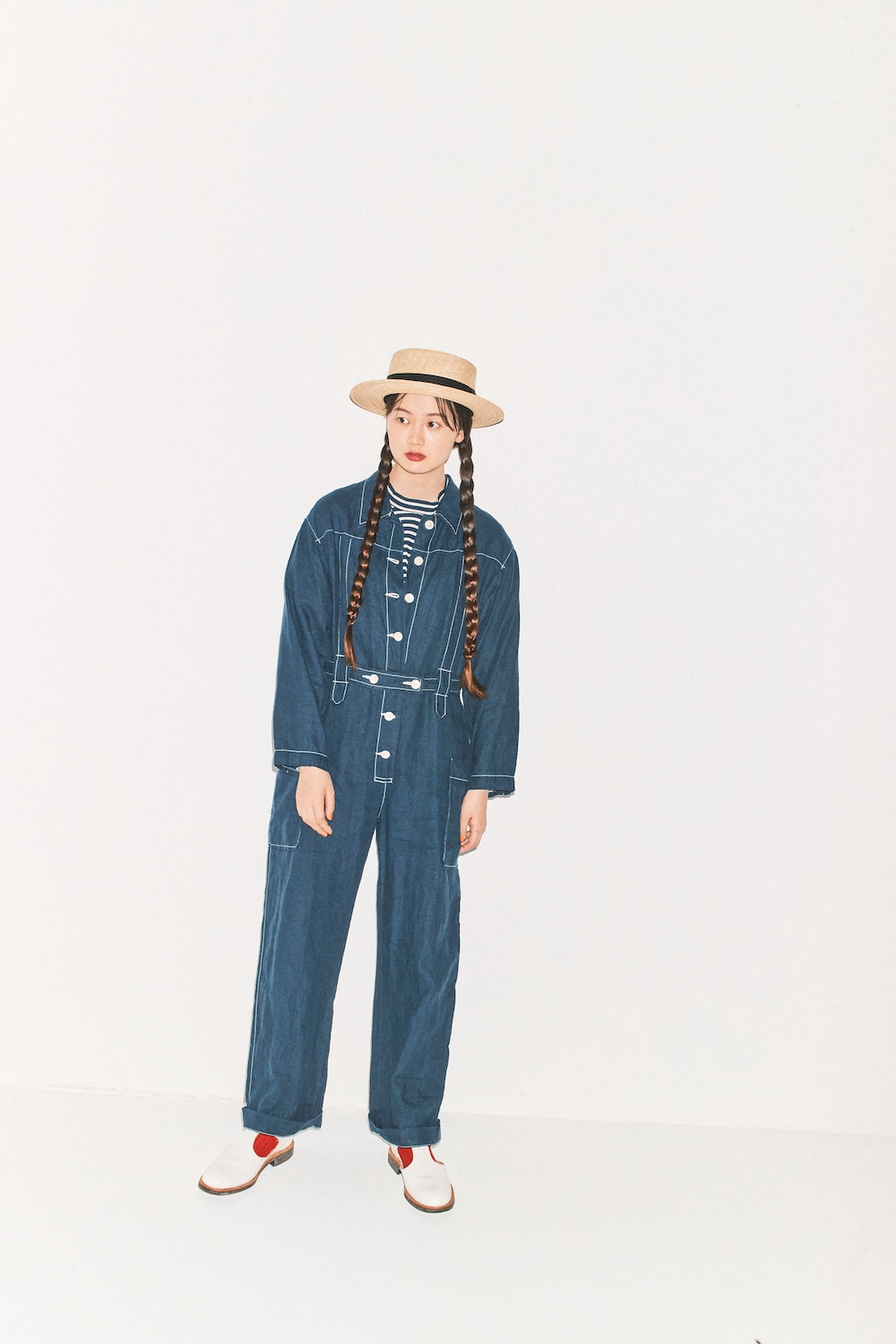 Tシャツ¥12980 / MidiUmi(マザーズ インダストリー)、オールインワン¥63800 / Nigel Cabourn WOMAN(アウターリミッツ)、ハット¥15400 / OVERRIDE(オーバーライド 神宮前)、ソックス¥2640 / HOiSUM(ホイサム)、シューズ¥70400 / SANDERS(サンダースジャパン)