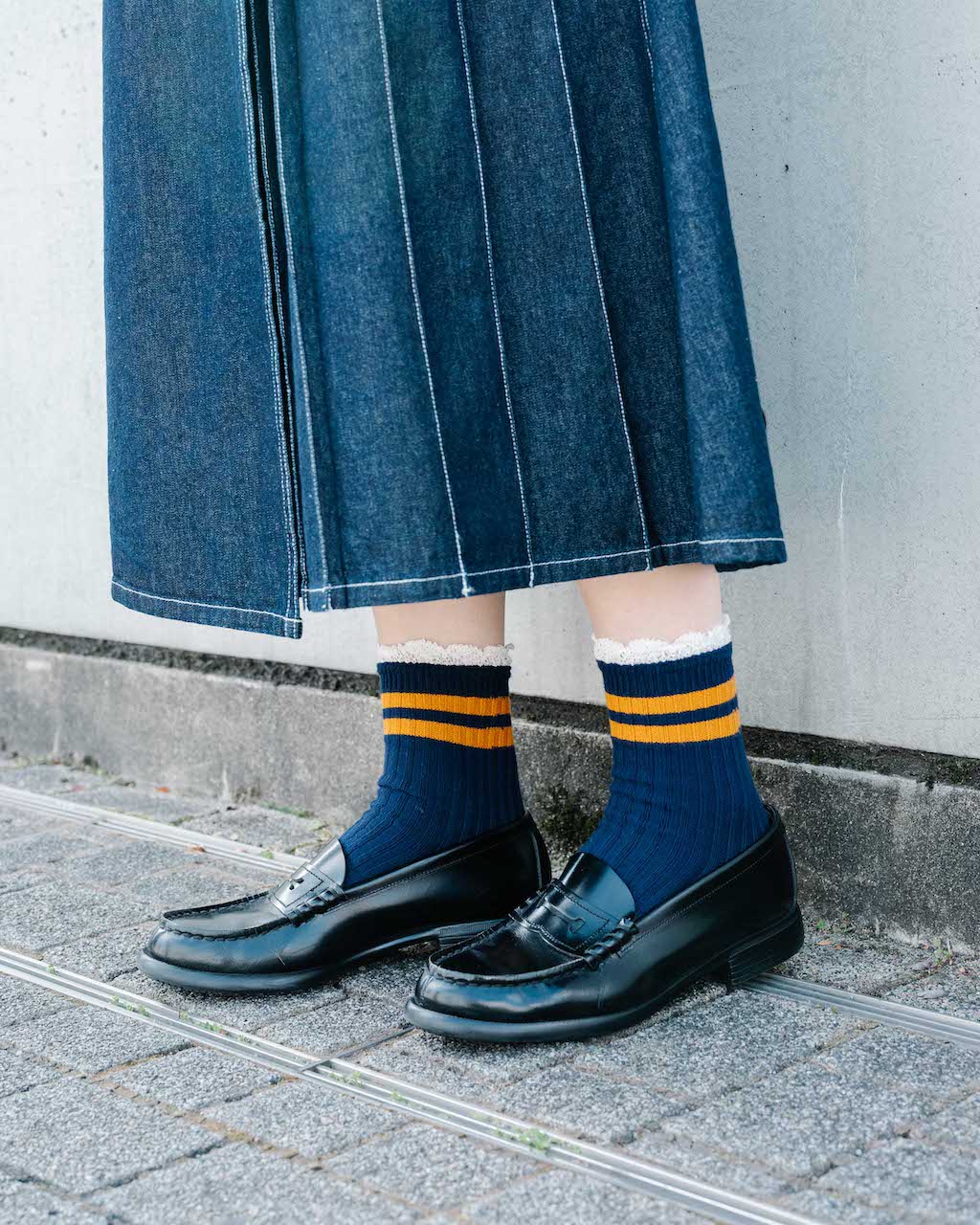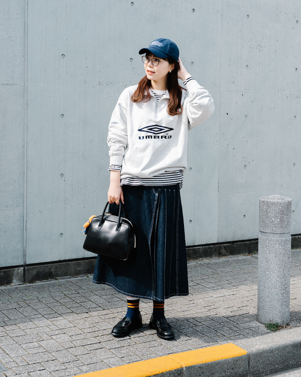 スポーティなスウェット&デニムスカートは一見ラフになりがちだけど、プリーツデザインのスカートに合わせて、ローファー&ソックスでトラッドテイストに寄せるとよりオシャレ感が際立つ。