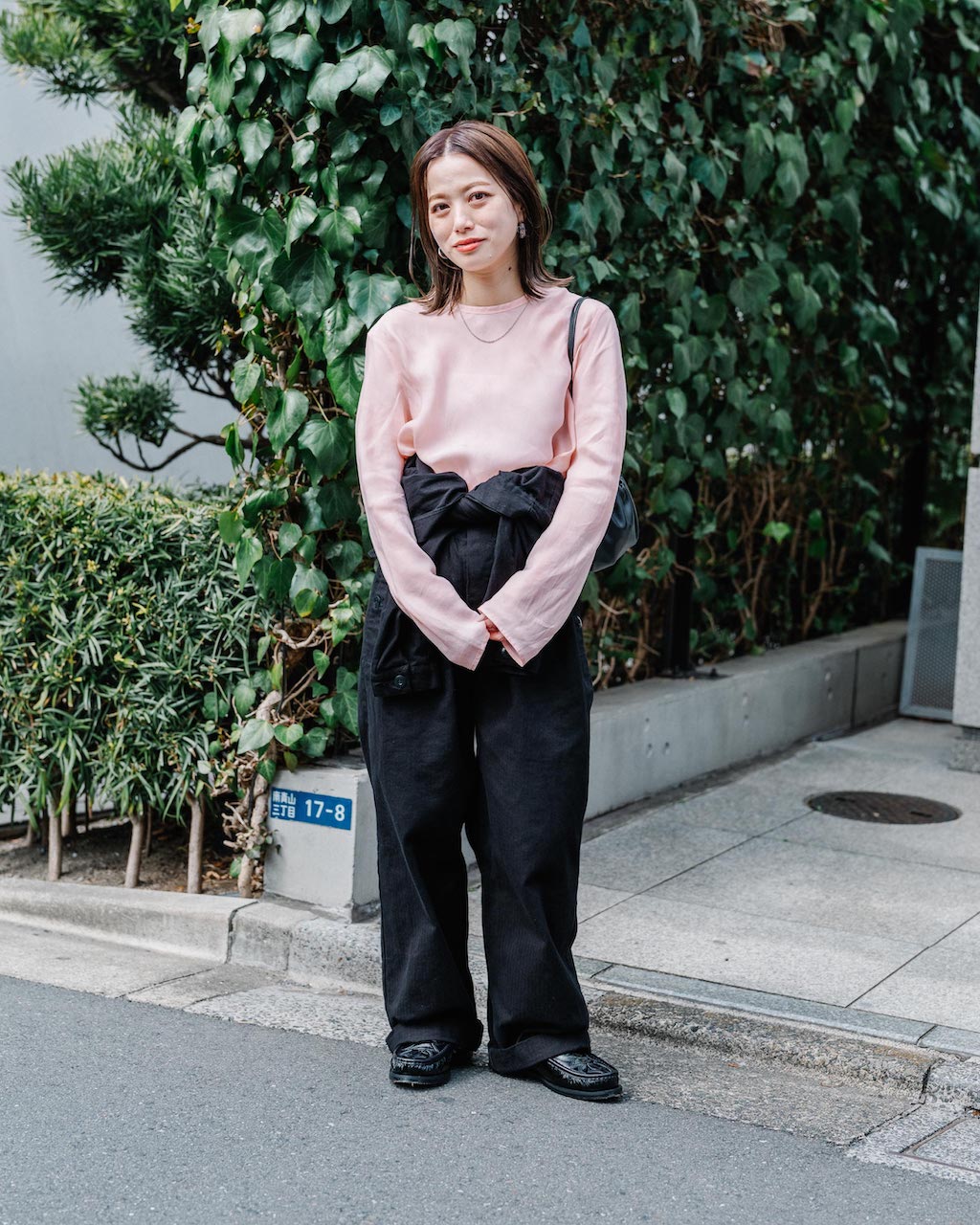 黒のジャンプスーツを腰巻きして、淡いピンクトップスを合わせた甘辛MIXタッグ。足元はデザイン性の高いローファーでカジュアルコーデを一新! 様々なギャップを効かせた上級者ルック。