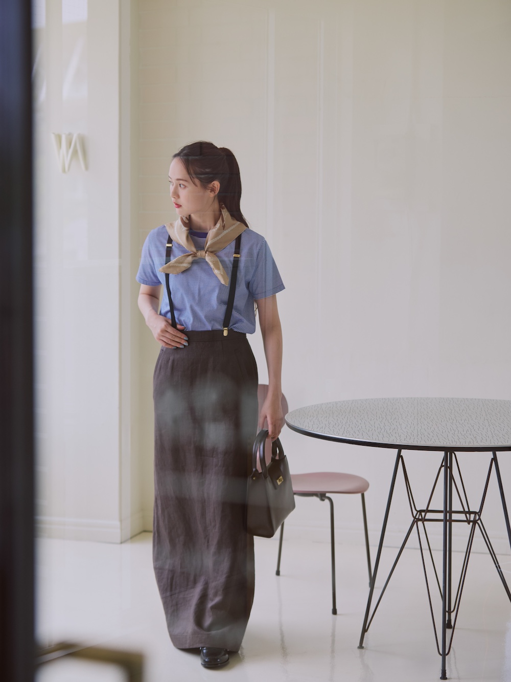 Tシャツ¥9900/MICA & DEAL(マイカ アンド ディール 恵比寿店)、スカート¥52800/BEIGE,(オンワード樫山 お客様相談室)、サスペンダー¥13200/ALBERT THUESTON(真下商事)、スカーフ¥24200/A Piece of Chic(グラストンベリー ショールーム)、バッグ¥18700/TIDEWAY(タイドウェイ 原宿店)、シューズ¥42900/REGAL(リーガルコーポレーション)