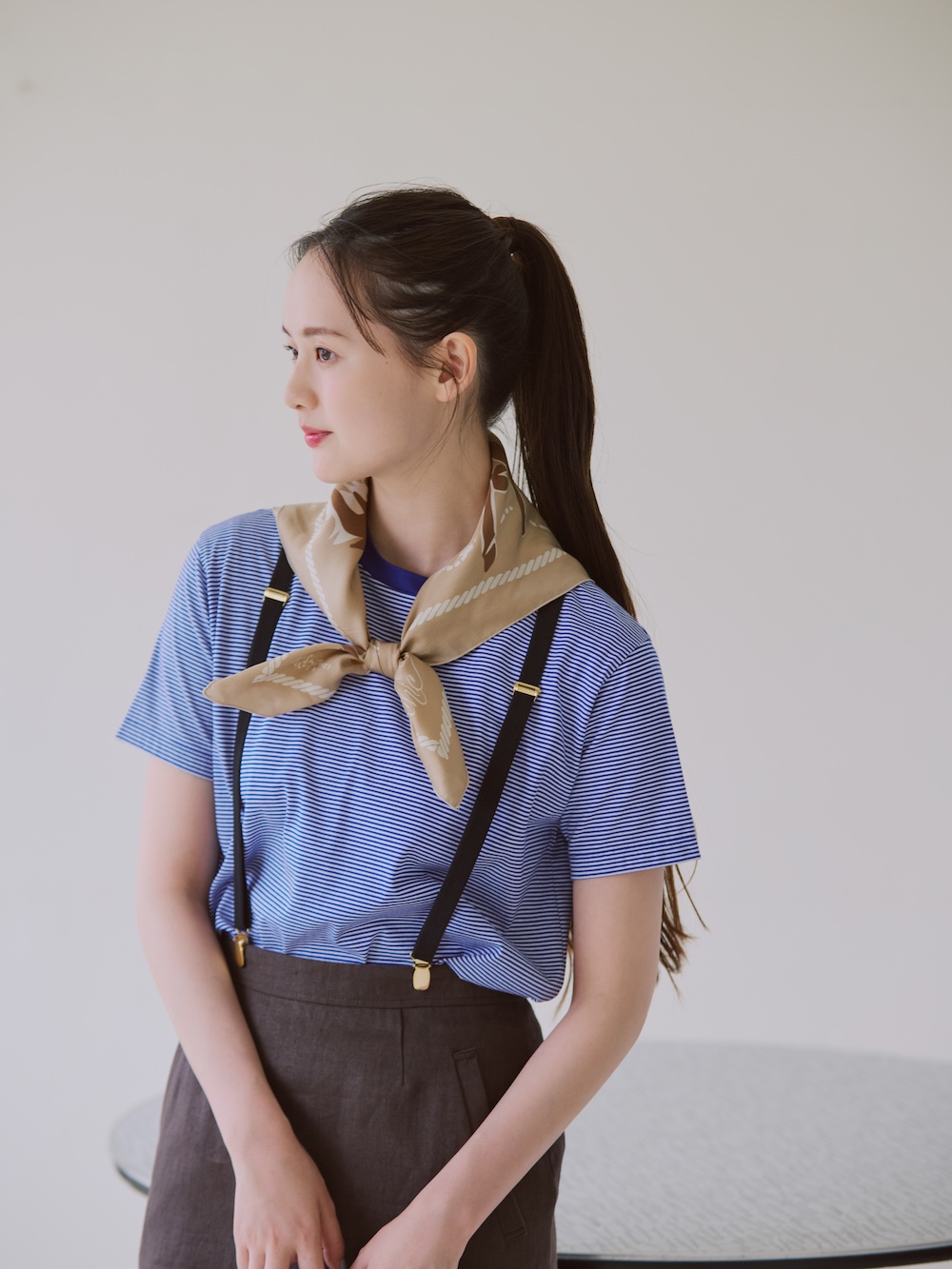 ヘアアレンジやバッグに括りつけるだけで、見た目をクラスアップさせてくれるのがスカーフの魅力。ラフなボーダーTシャツに巻くだけでも同様の効果が!またサスペンダーに、シャープなシルエットが叶うタイトなスカートを合わせることで、きちんとしながらレディなエッセンスが加わる。