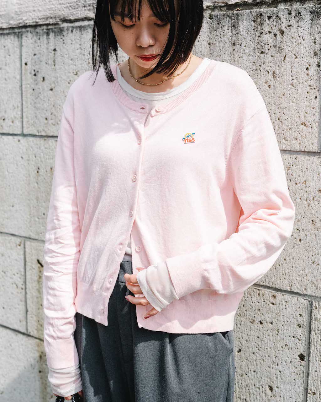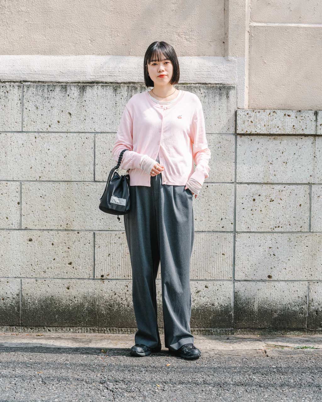 ペールピンクのカーディガンとグレースラックスで春らしい色合いのキレイめスタイルが完成。きちんと感が演出できる黒小物を投入すると装いも引き締まりメリハリがアップ!