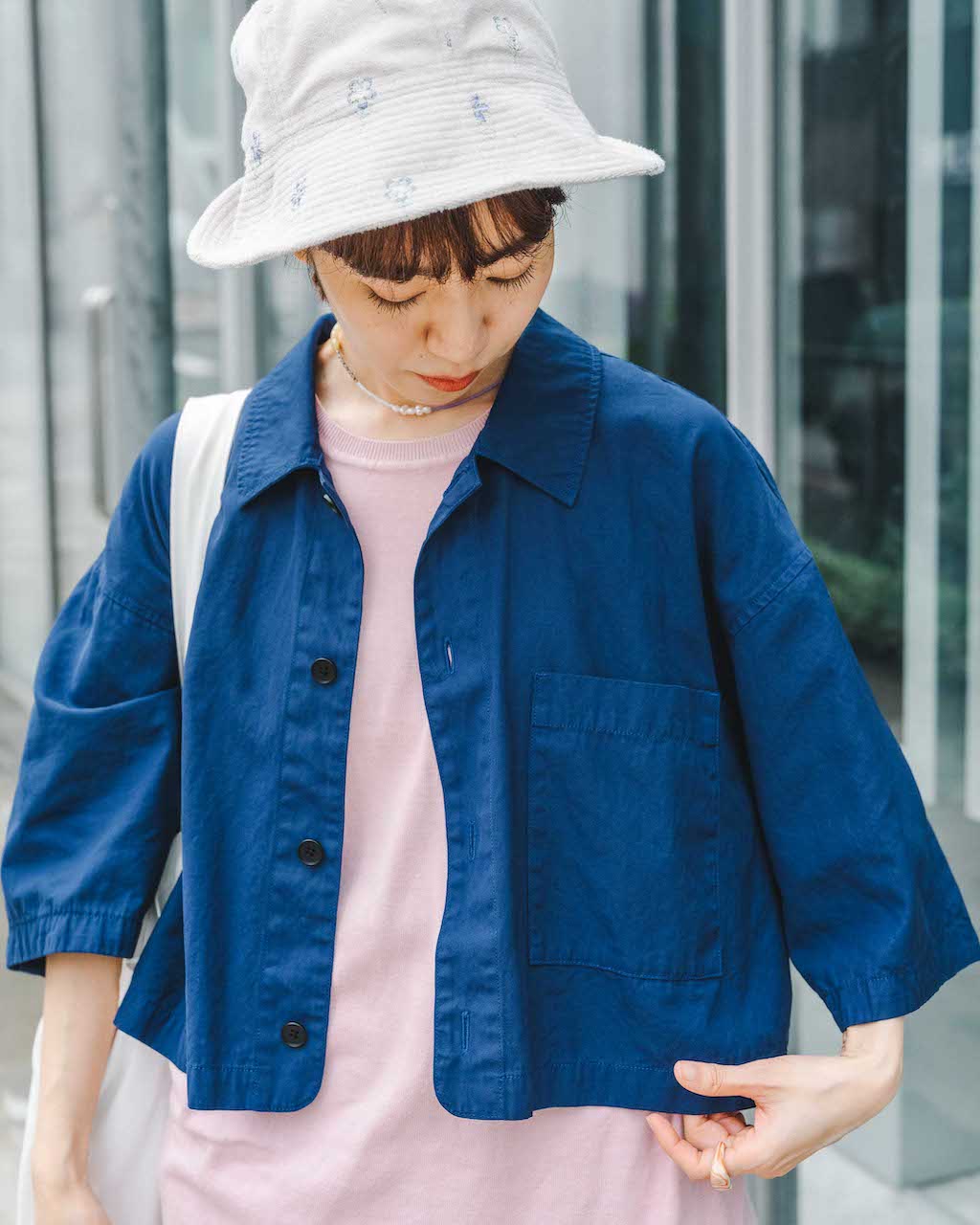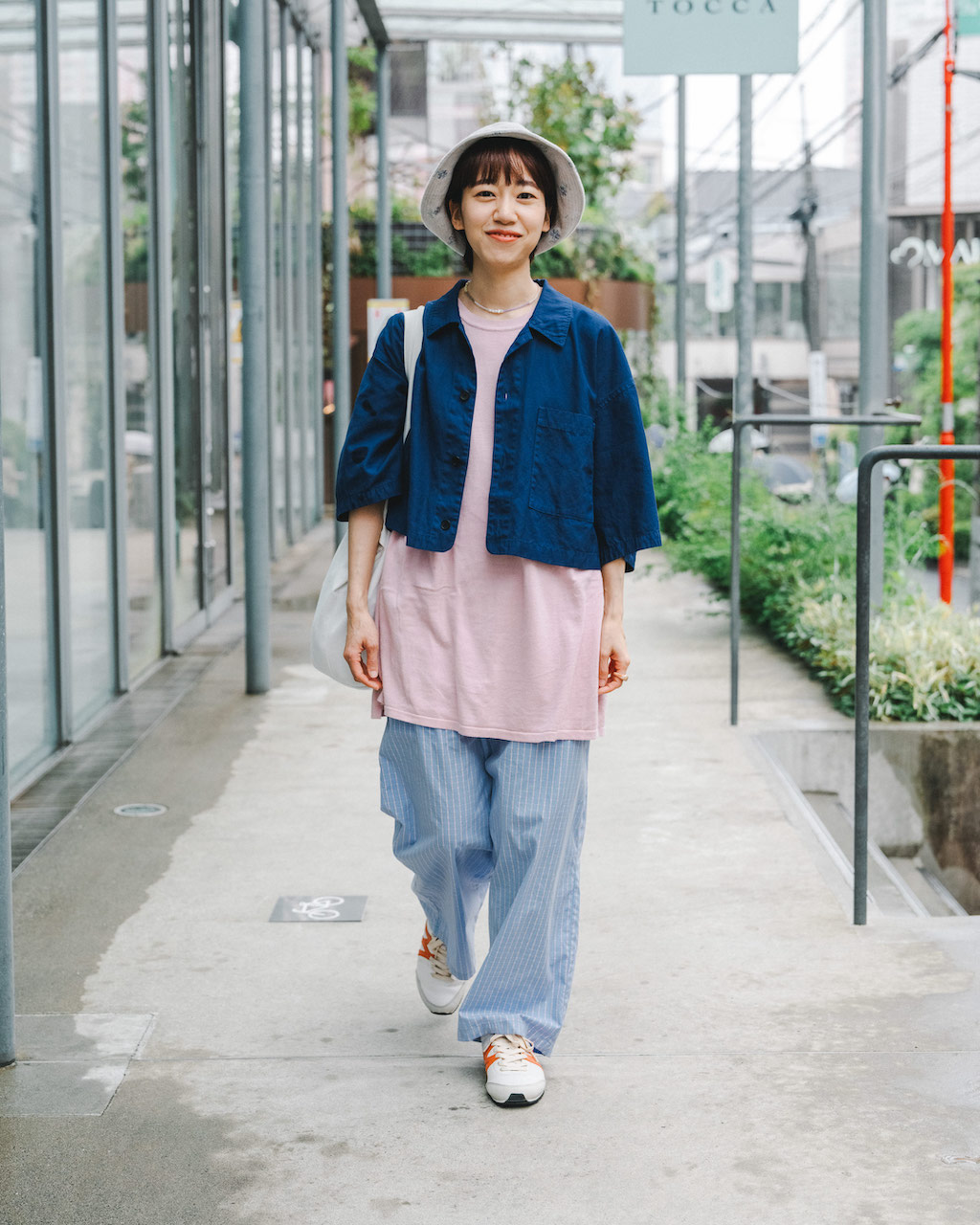 初夏らしい涼しげなブルー系の寒色コーデは、反対色のピンクを差し色にすると引き立てあい、より深みのある着こなしになる。カジュアルなハットやスニーカーで気負わないスタイルへ。