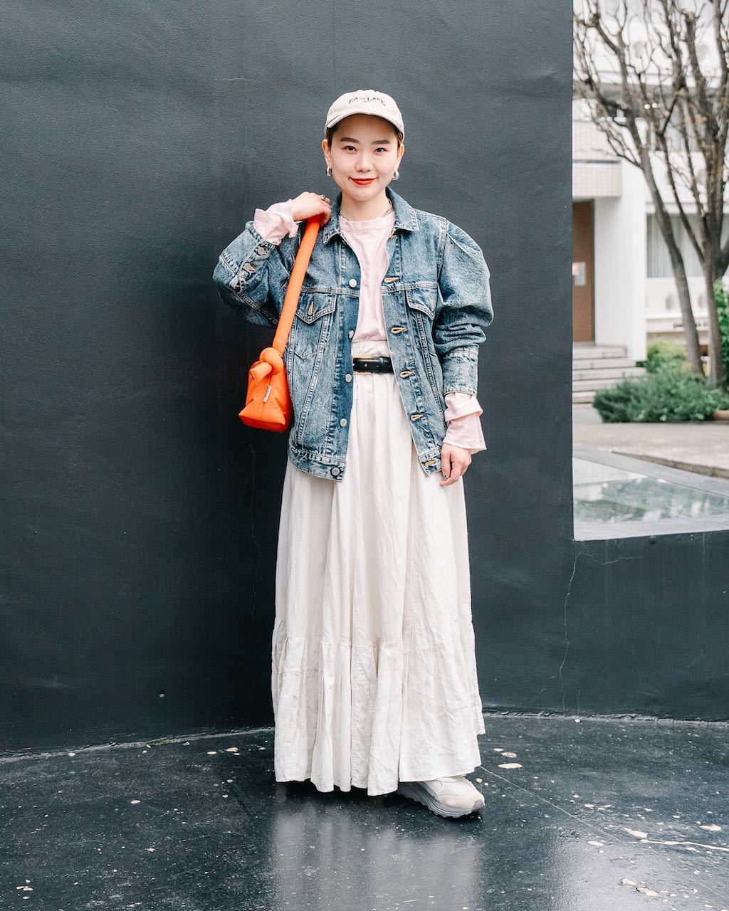 コーディネート3:淡いピンクとデニムジャケットのギャップがいい