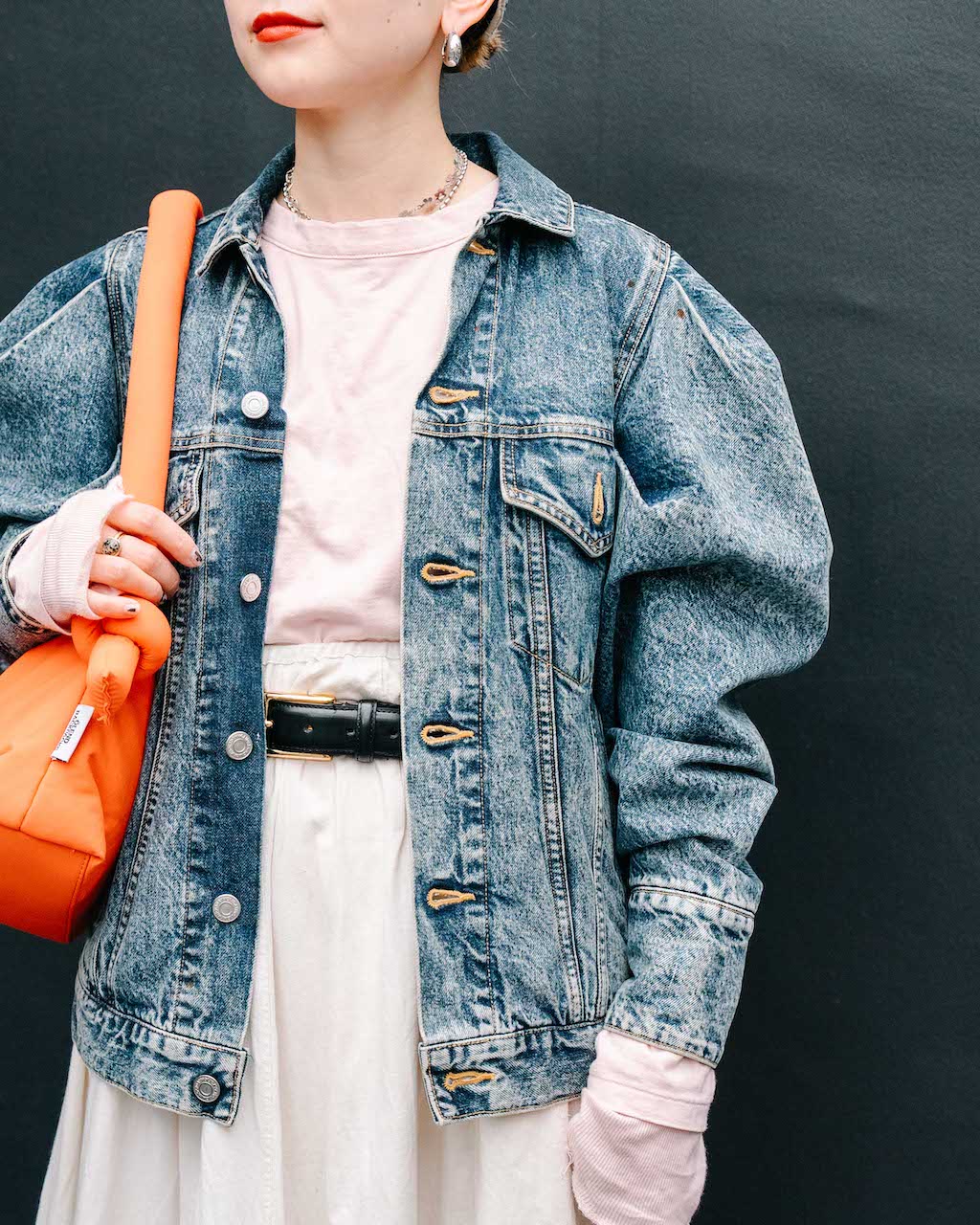 ゆったりシルエットがこなれ感満載のデニムジャケットは、ピンクトップス&ホワイトスカートという淡いトーンでまとめて初夏の装いに。黒のベストで引き締めるとバランス良し。