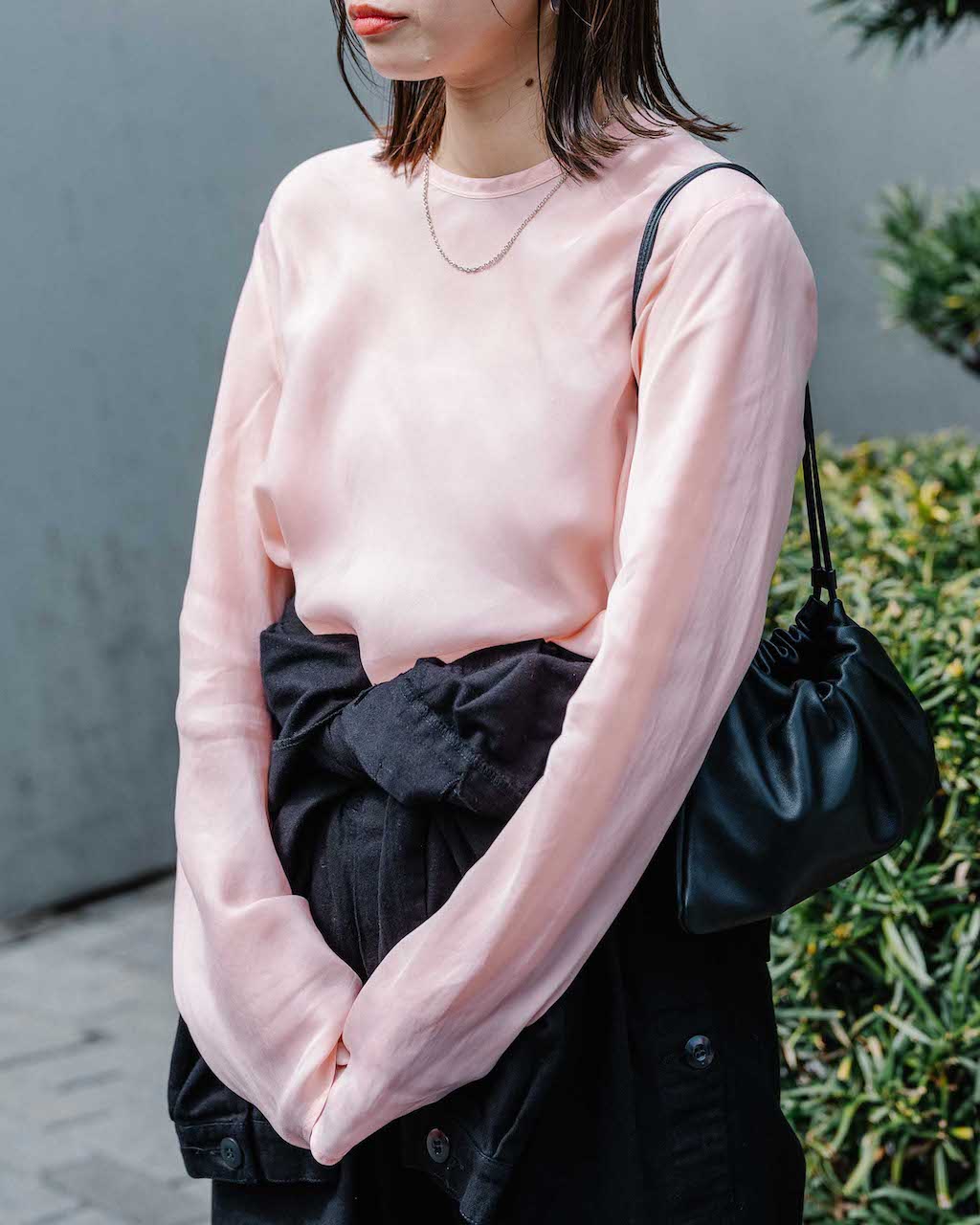 ▶︎春のブラックコーデは、透け感のあるピンクを合わせて甘さと軽さを足し算