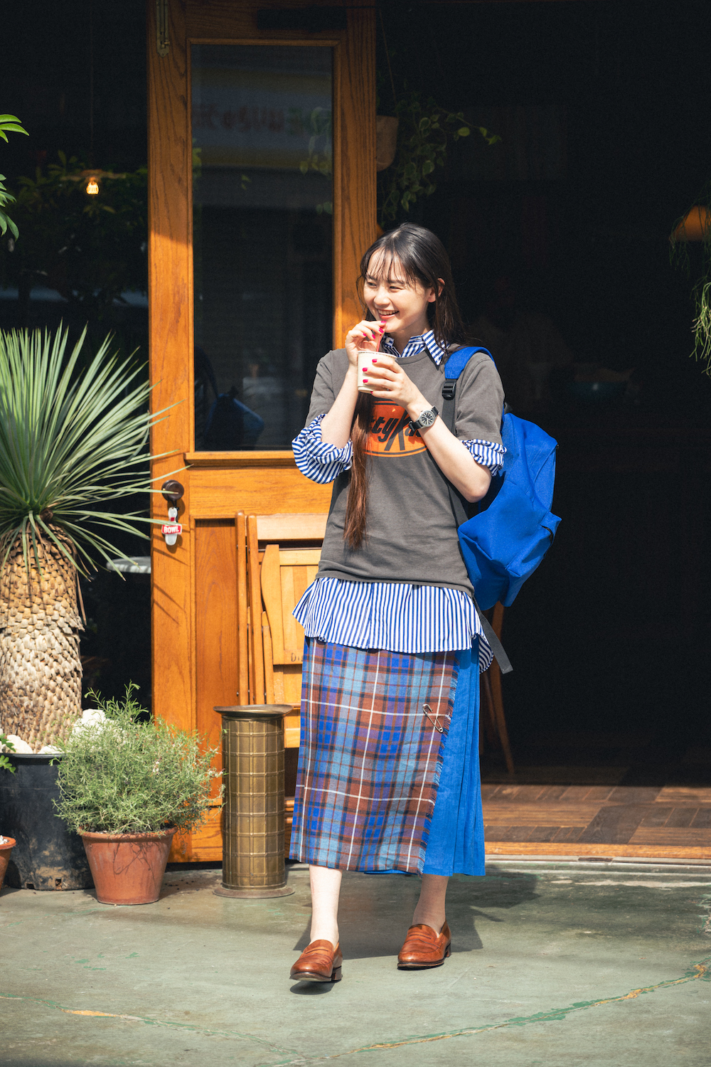 いつもより早起きをして本屋に出勤する前にカフェへ。Tシャツは1枚で着るのも可愛いけれど、ストライプシャツをINしてアレンジ。Tシャツの袖に合わせてシャツの袖をくるくる、裾からもストライプ柄を少しだけ見せるこのバランスがこなれて見せるポイントです。チェックスカート、ストライプシャツ、デイパックはトーンを揃えてまとまりのある装いに。