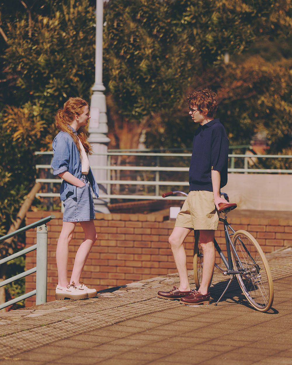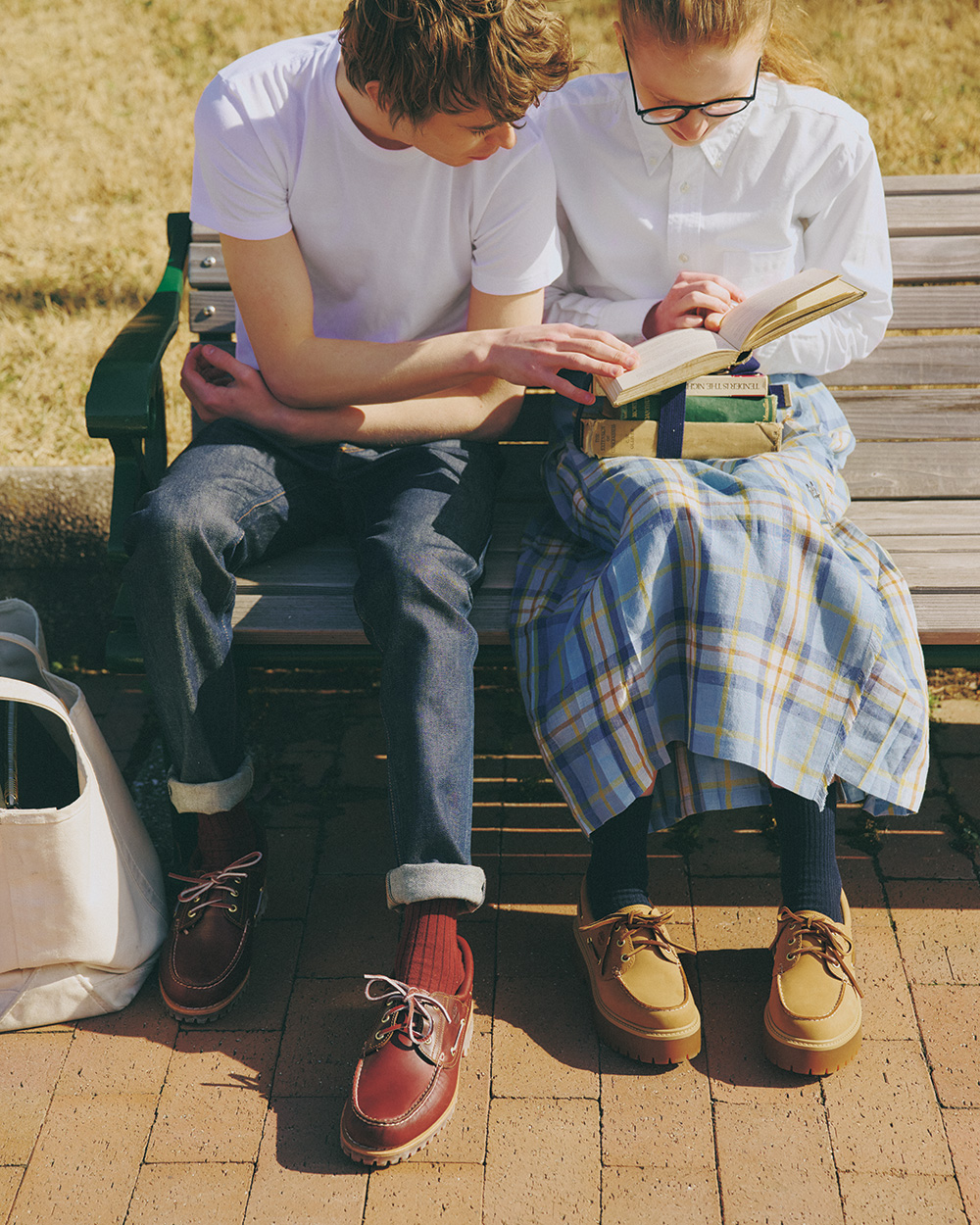 「ここ、いいところだよ」と、彼が指差す活字を追いかける放課後。いつもの公園のベンチで、夕陽に照らされるふたりの足元には《ティンバーランド》のシューズが。彼女は約4cmのソールを備えたモダンな厚底「ストーンストリート」、彼はトラディショナルな「スリーアイクラシック」を愛用中。マイルドなウィート(小麦色)や上品なバーガンディが、爽やかなサマースタイルを味わい深く仕上げていた。シューズを際立たせたり、同色で存在感を高めたり、ソックスの色選びも素敵だね。
